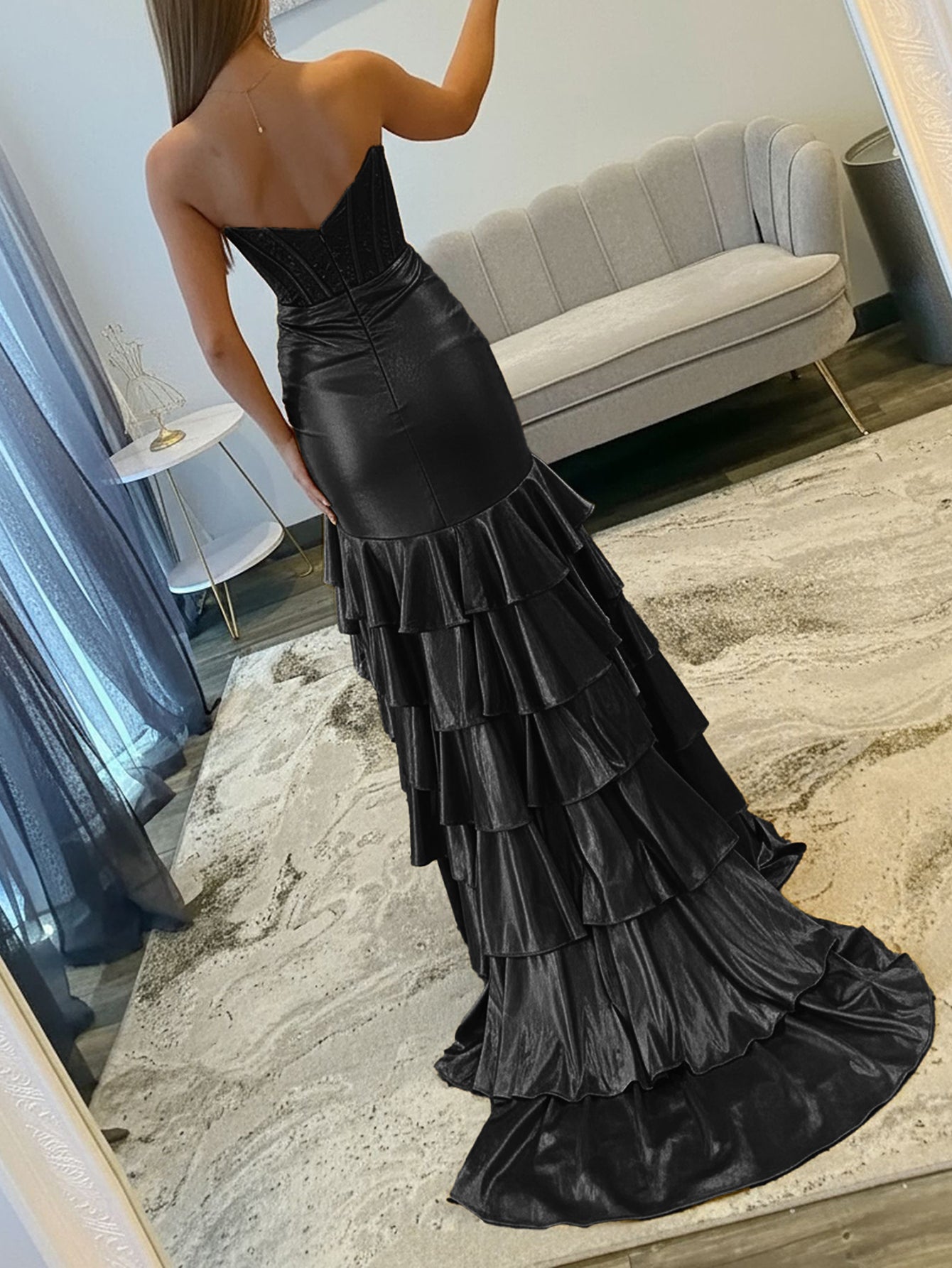 Luxury Crystal Ruffle Mermaid Prom Dress - Black