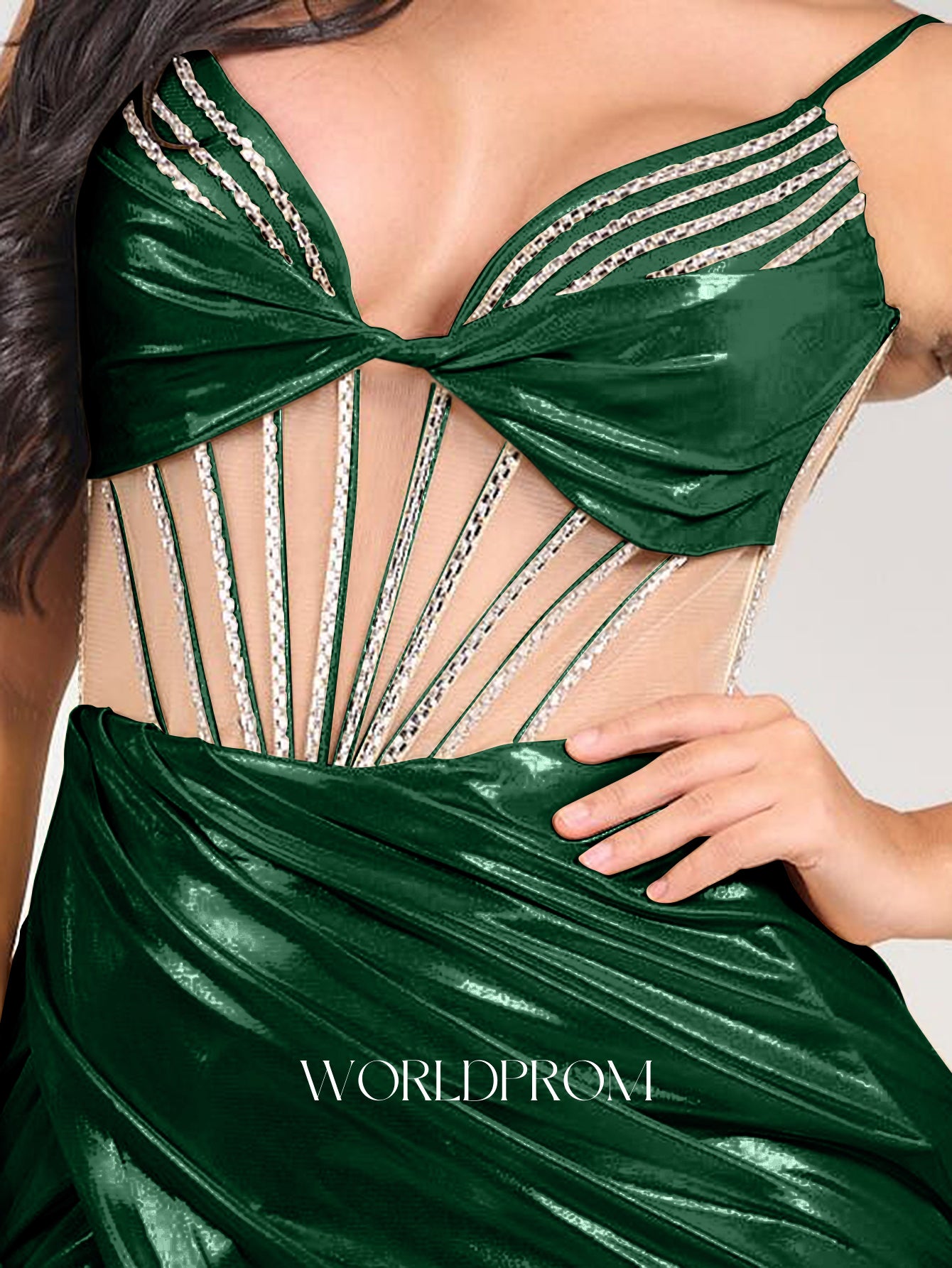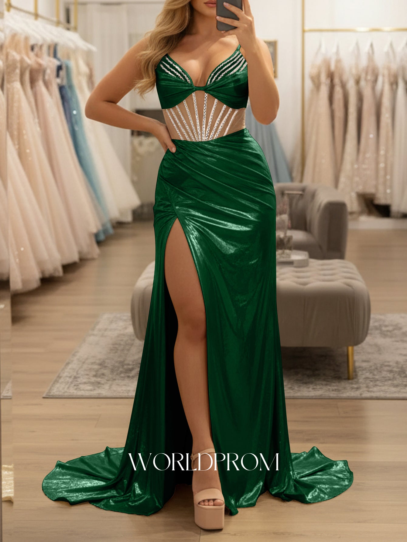 This sequin satin prom gown features crystal sheer on the illusion bodice. The lace up dress has a V-neckline and ruched split hem. Worldprom mermaid prom dresses are ideal for party, evening or festivals.