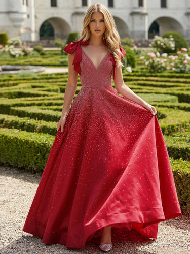 Luxury Hot Fix V-Neck A-Line Long Prom Dress With Bow - Red
