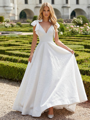 Luxury Hot Fix V-Neck A-Line Long Prom Dress With Bow - White