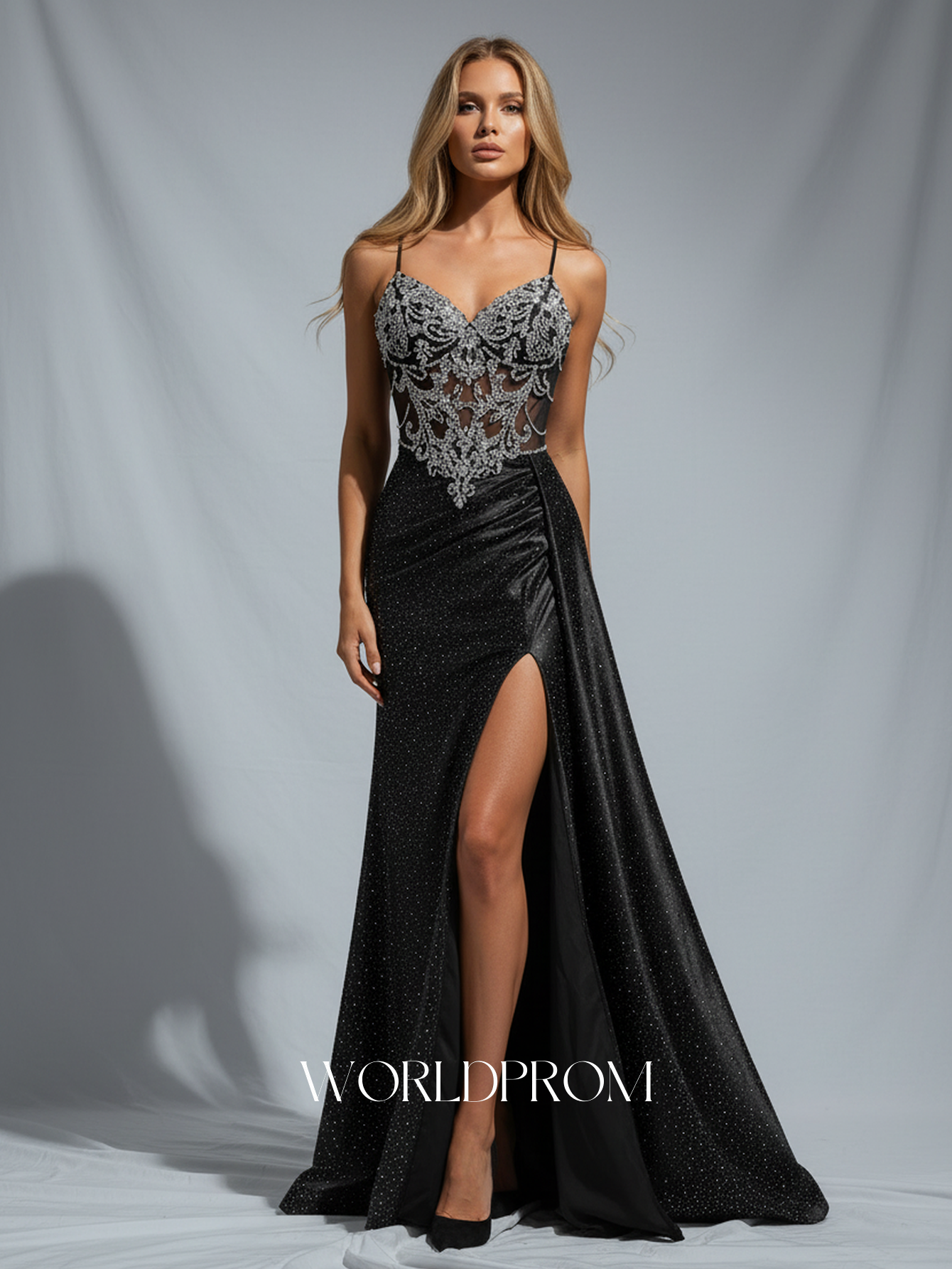 Details: Backless, Lace Embroidery, Crystals, Split, With Waist Drop, Illusion, Sheer, Pleated