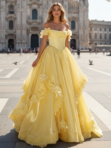 Off Shoulder 3D Flowers Ruched Bust Pleated Long Ball Gown Prom Dress - Goose Yellow