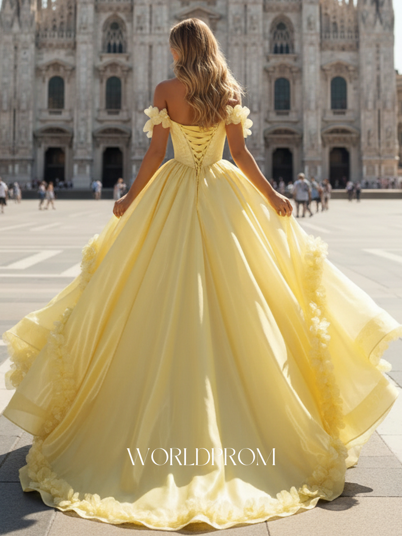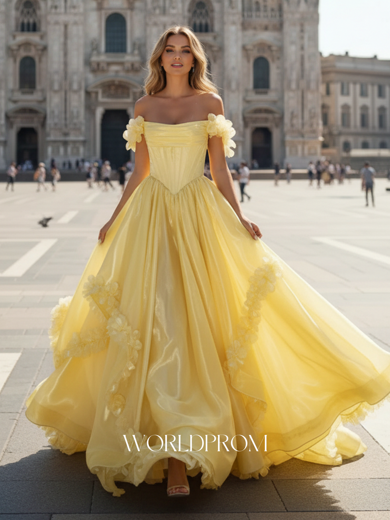 This organza prom gown features ruched waist on the bodice. The off shoulder dress has a scoop neck and pleated hem with 3d flowers. Worldprom ball gown prom dresses are ideal for party, evening or festivals.