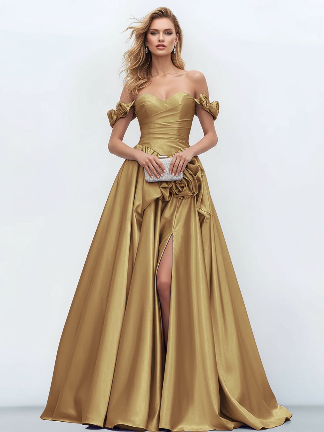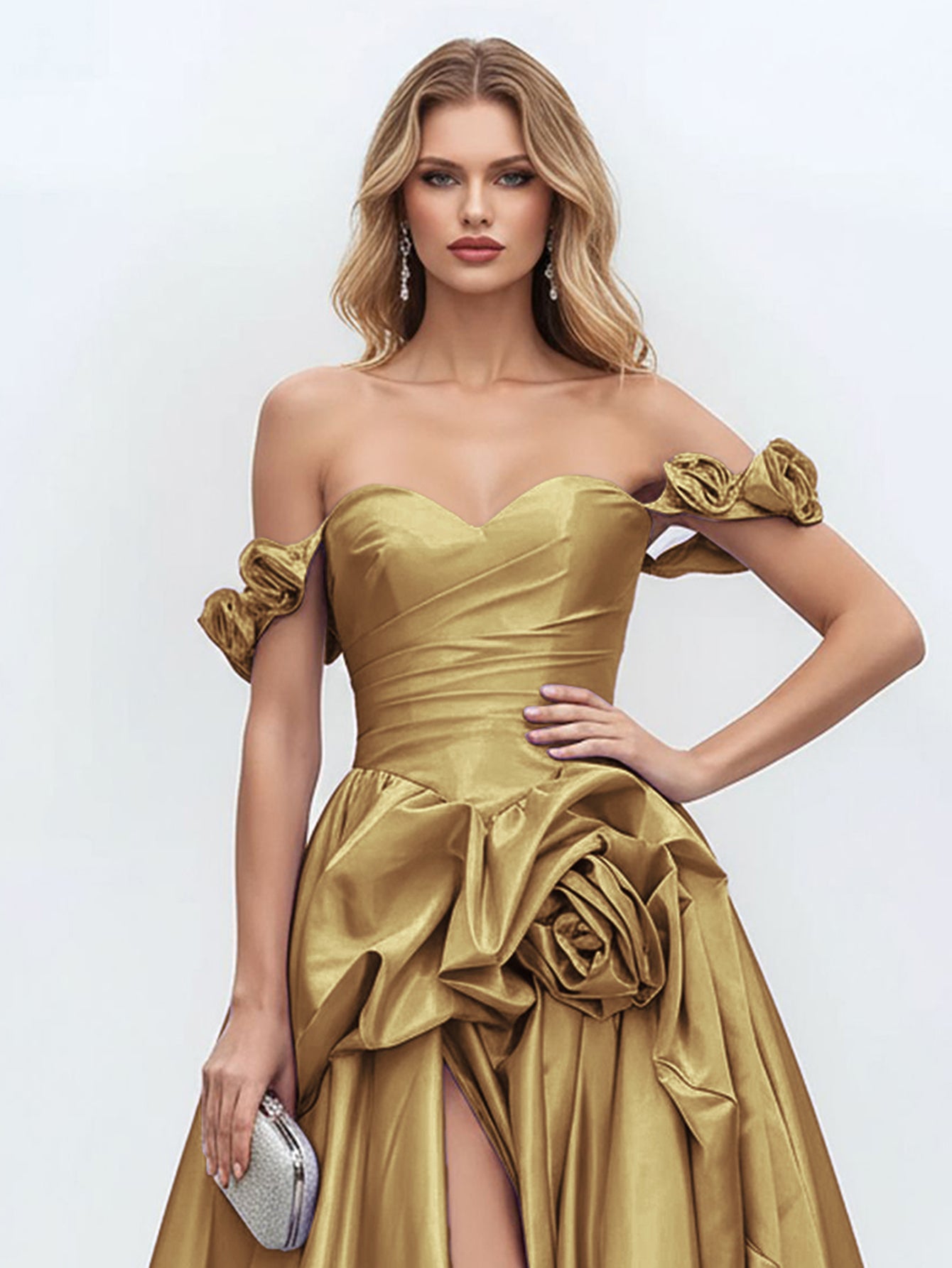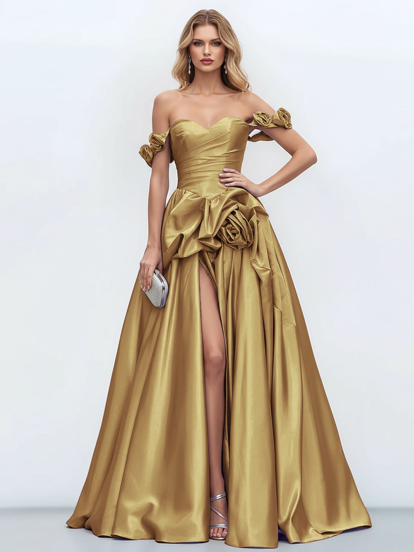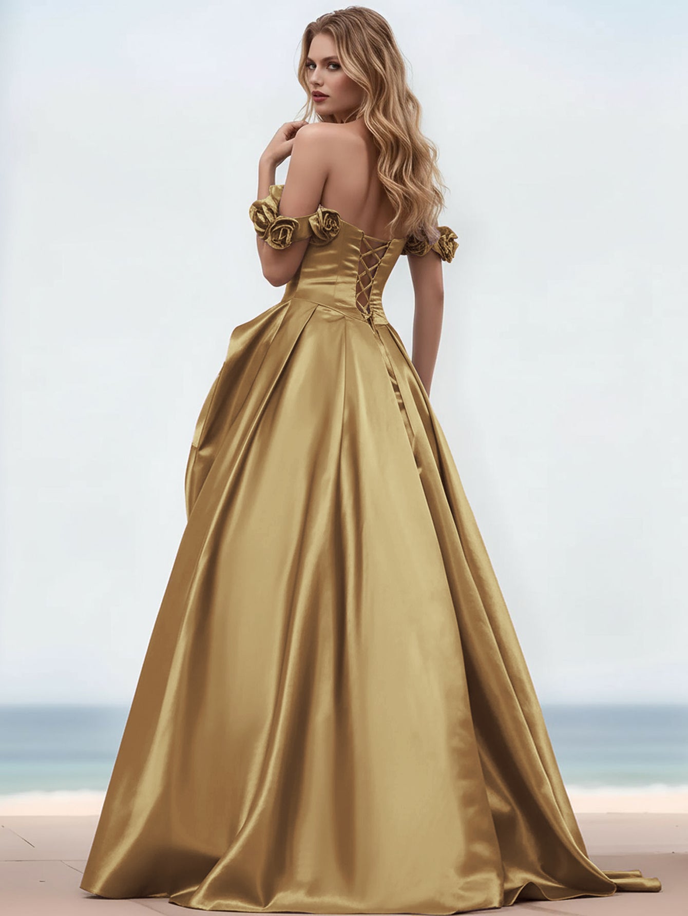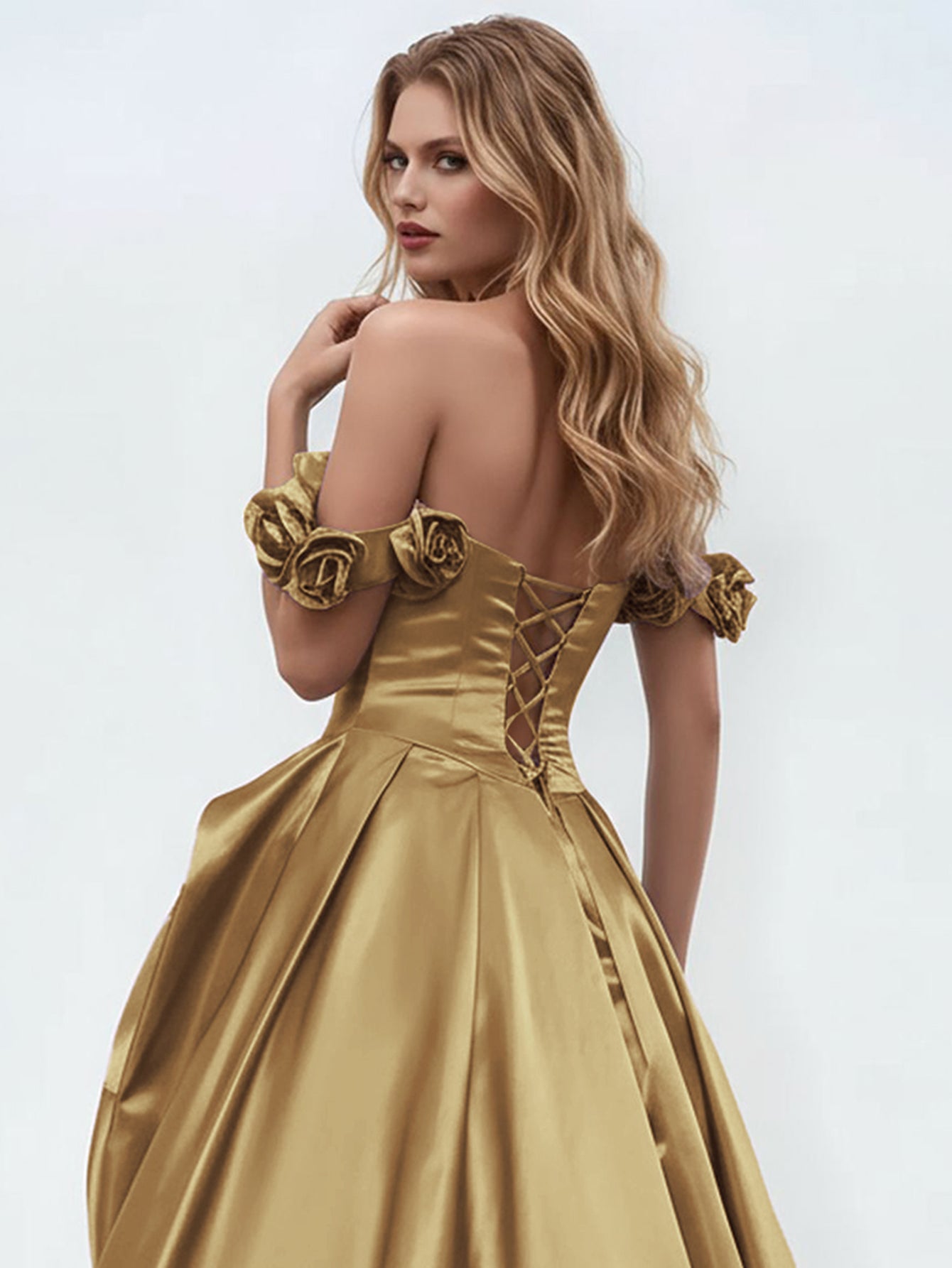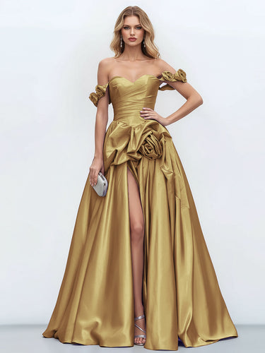 Off Shoulder 3D Rose Pick Up Satin Ball Gown Evening Dress - Gold