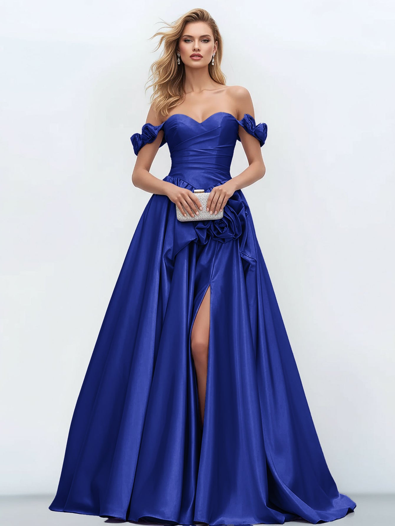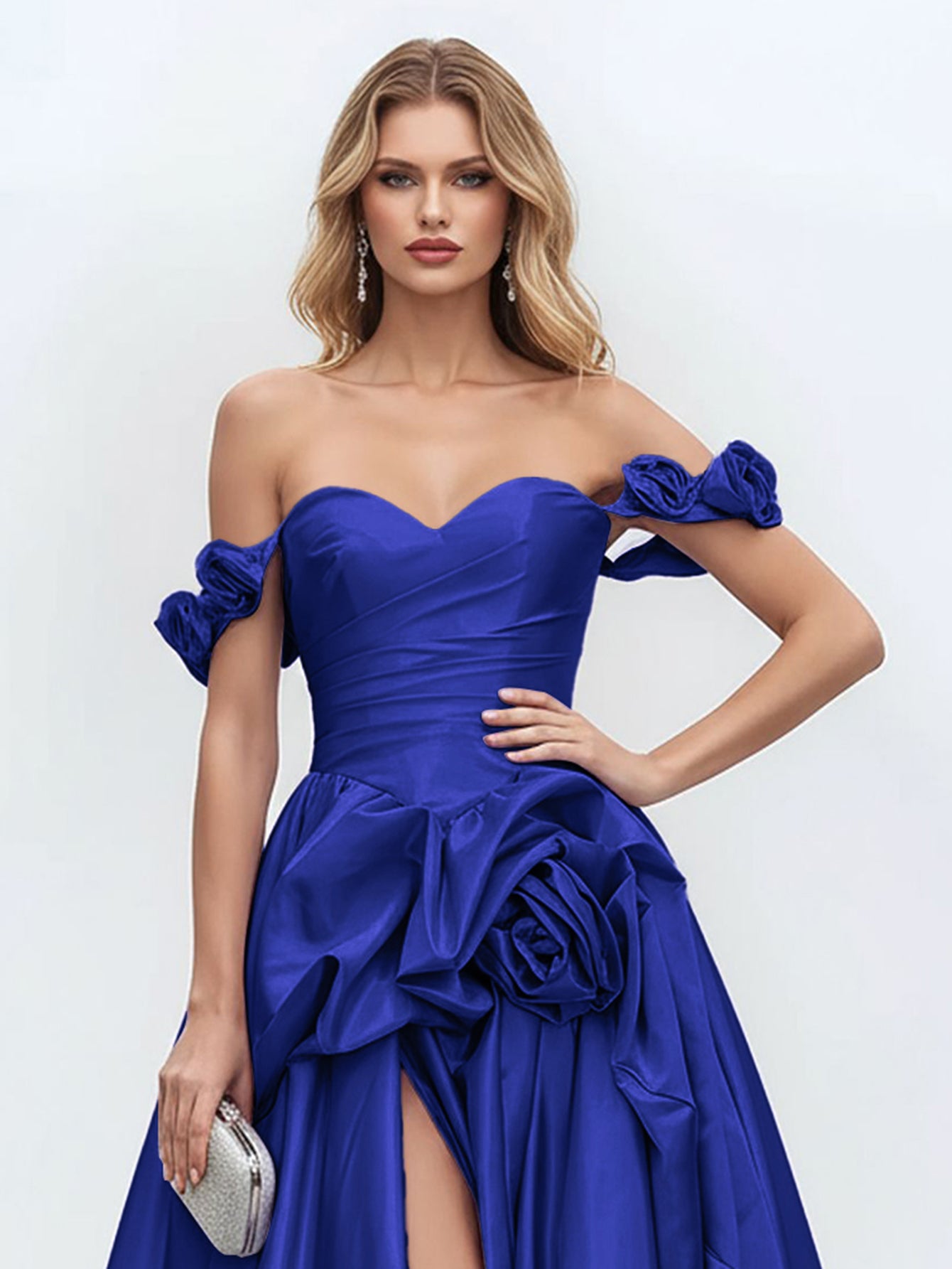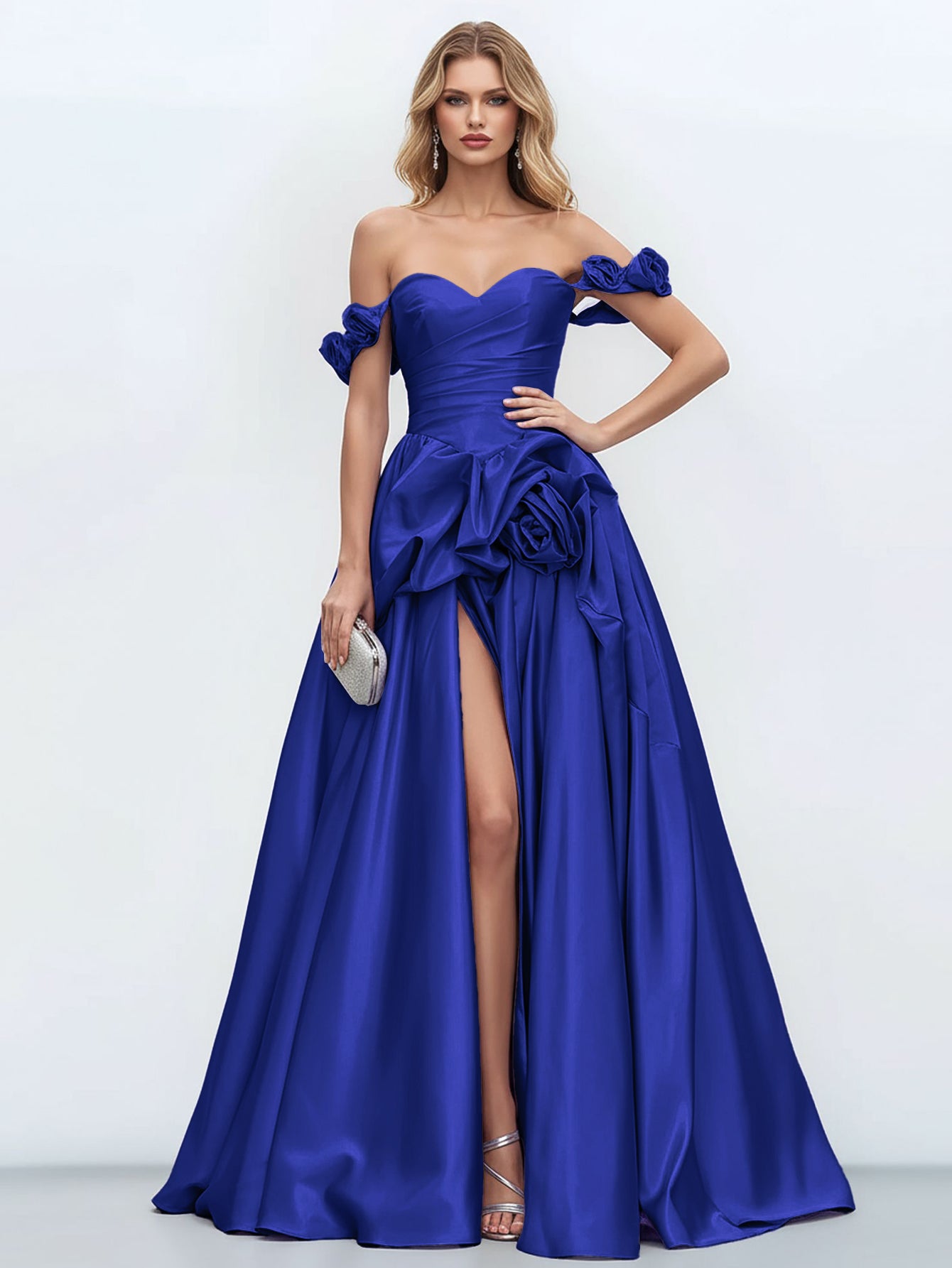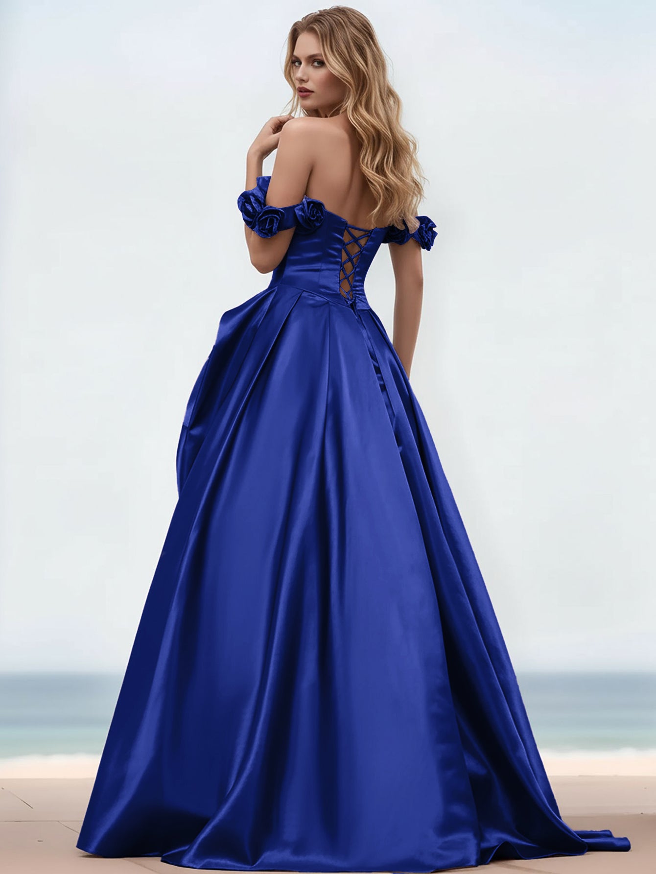 Off Shoulder 3D Rose Pick Up Satin Ball Gown Evening Dress - Royal Blue