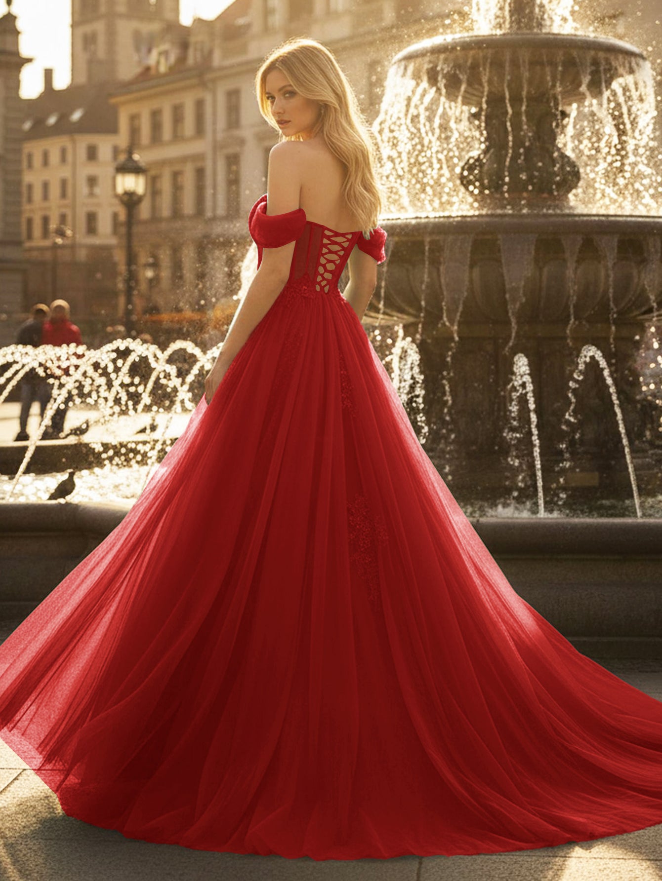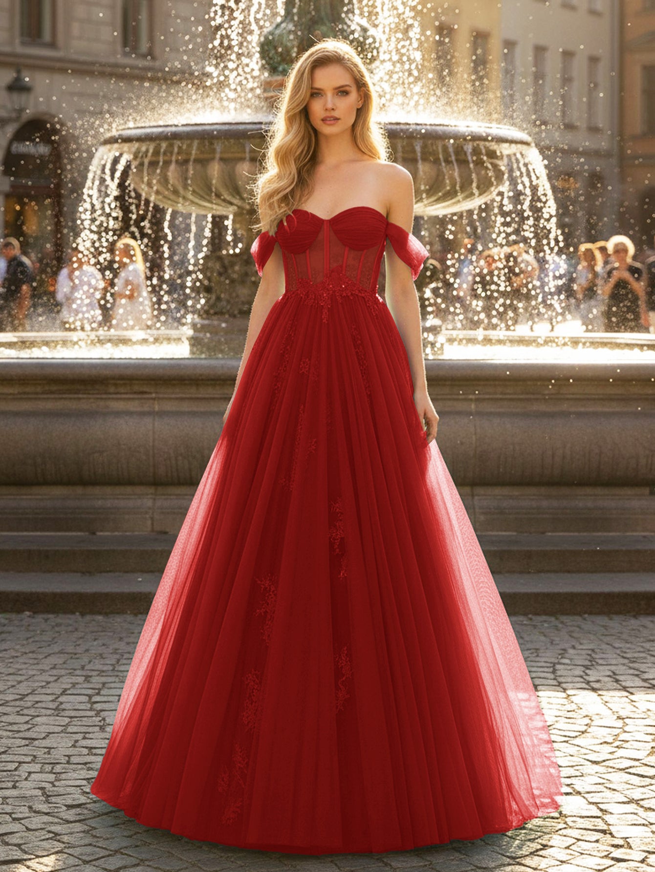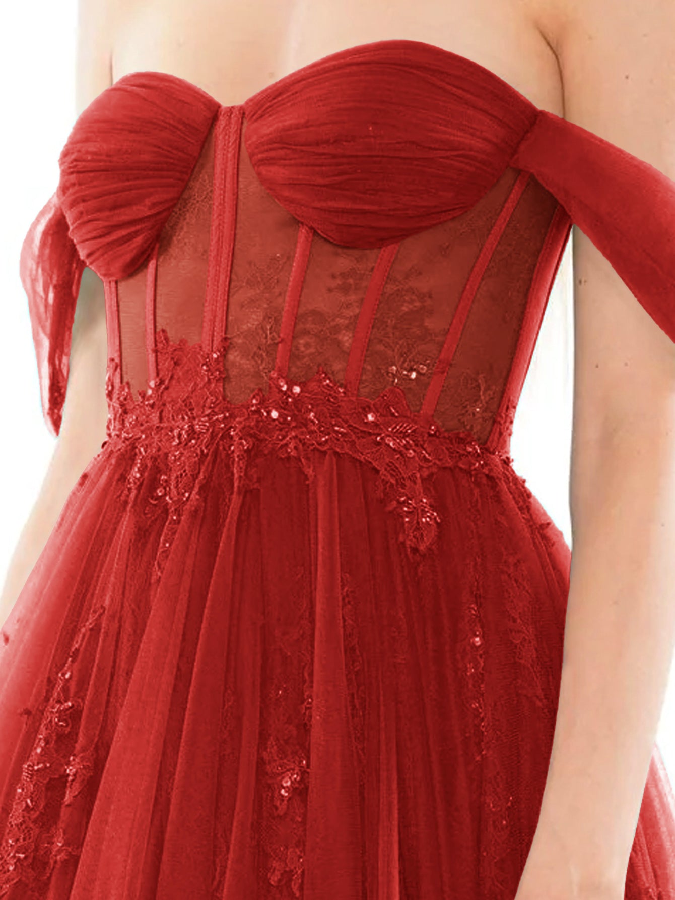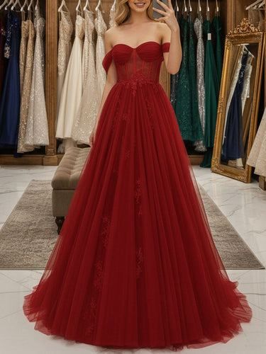 Off Shoulder Bodice Embroidery Lace Ball Gown Evening Dress - Red