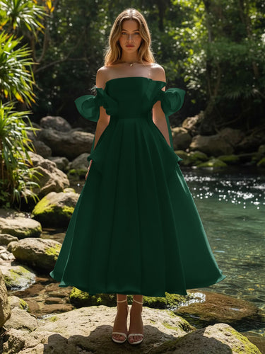 Off Shoulder Bow Bodice Satin Midi Ball Gown Prom Dress in Emerald Green