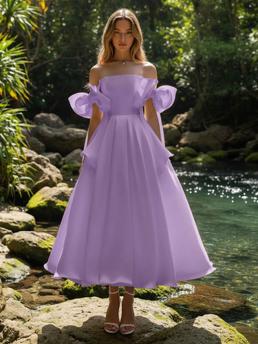 Off Shoulder Bow Bodice Satin Midi Ball Gown Prom Dress in Lilac