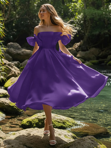 Off Shoulder Bow Bodice Satin Midi Ball Gown Prom Dress in Purple
