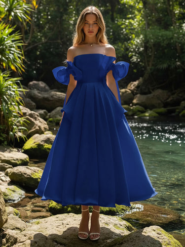 Off Shoulder Bow Bodice Satin Midi Ball Gown Prom Dress in Royal Blue