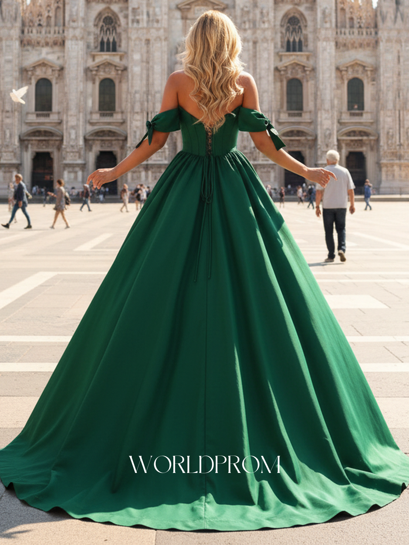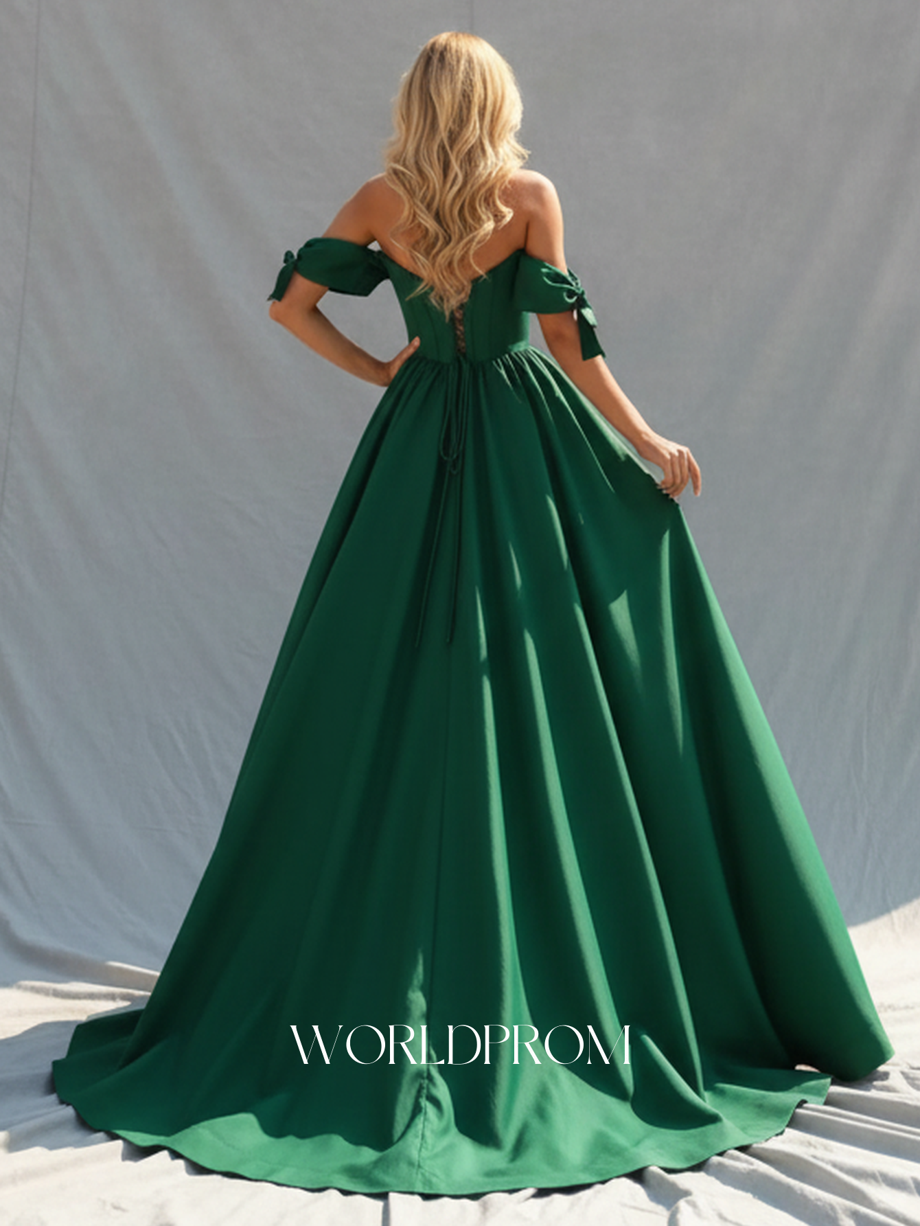 This satin prom gown features hot fix crystal with shoulder bow on the bodice. The off shoulder dress has a sweetheart neckline and pleated hem. Worldprom ball gown prom dresses are ideal for party, evening or festivals.