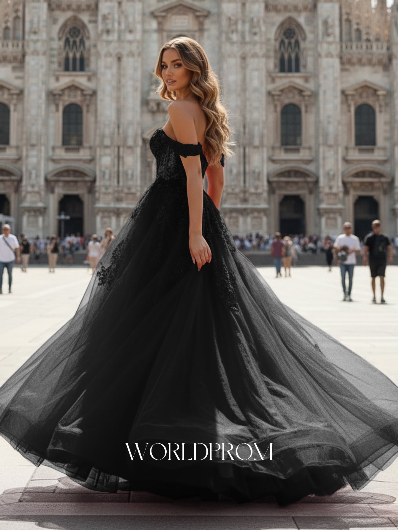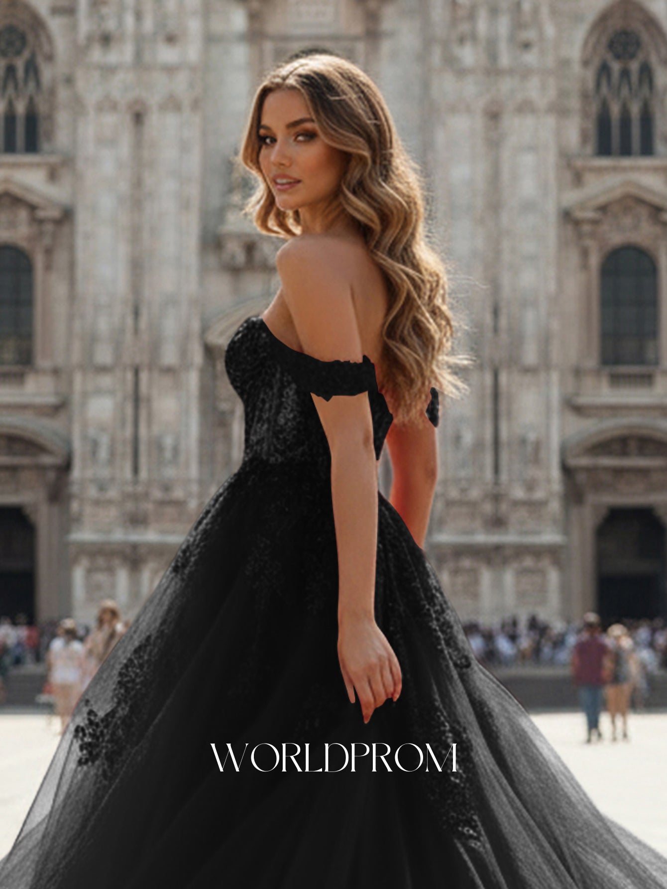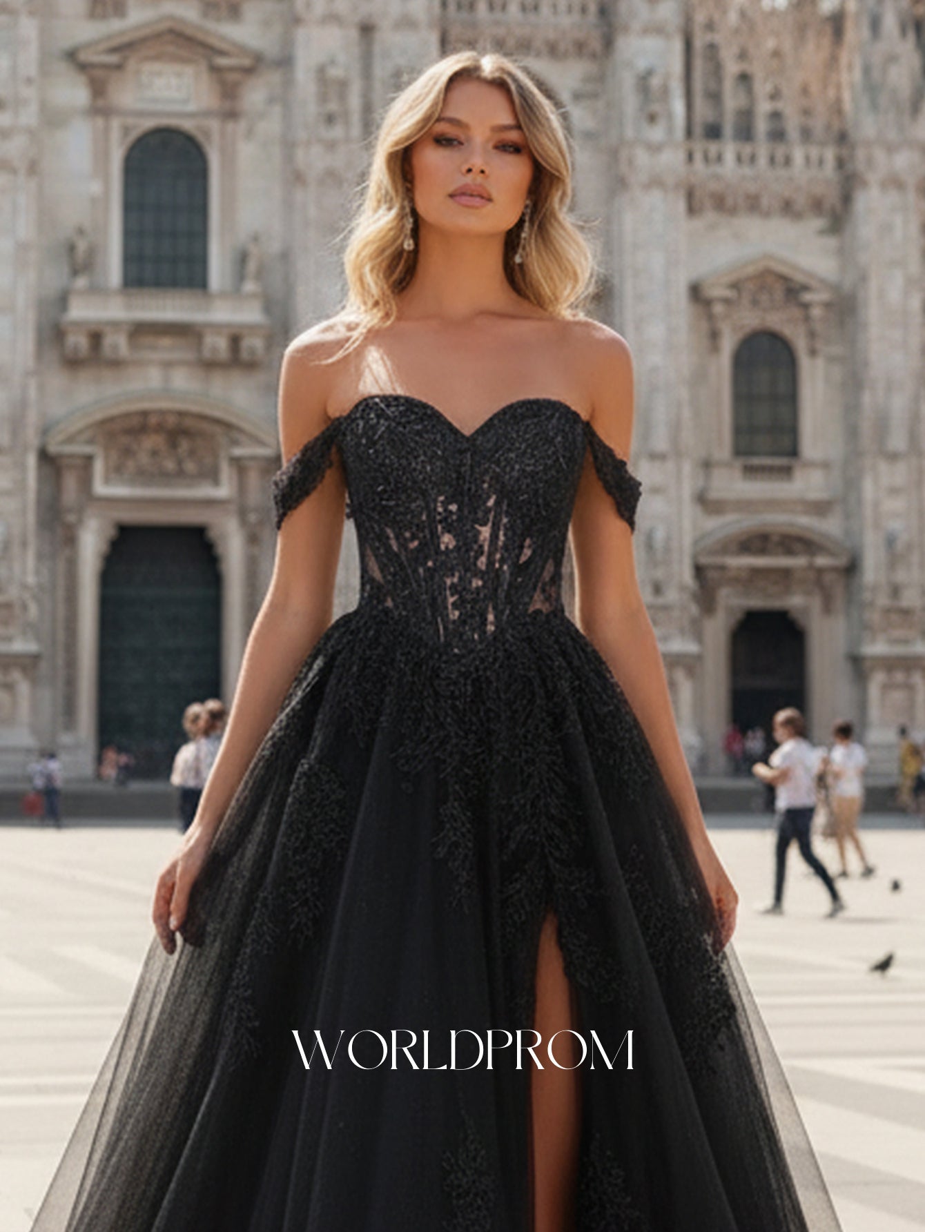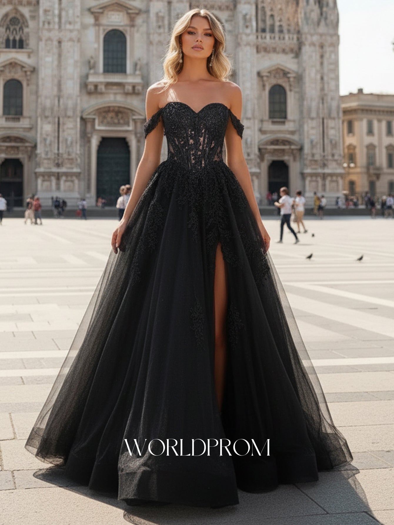 This tulle prom gown features hot fix with crystal sheer on the illusion bodice. The off shoulder dress has a sweetheart neckline and pleated split hem. Worldprom ball gown prom dresses are ideal for party, evening or festivals.