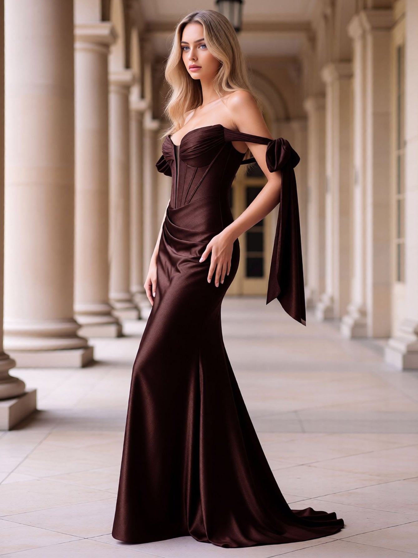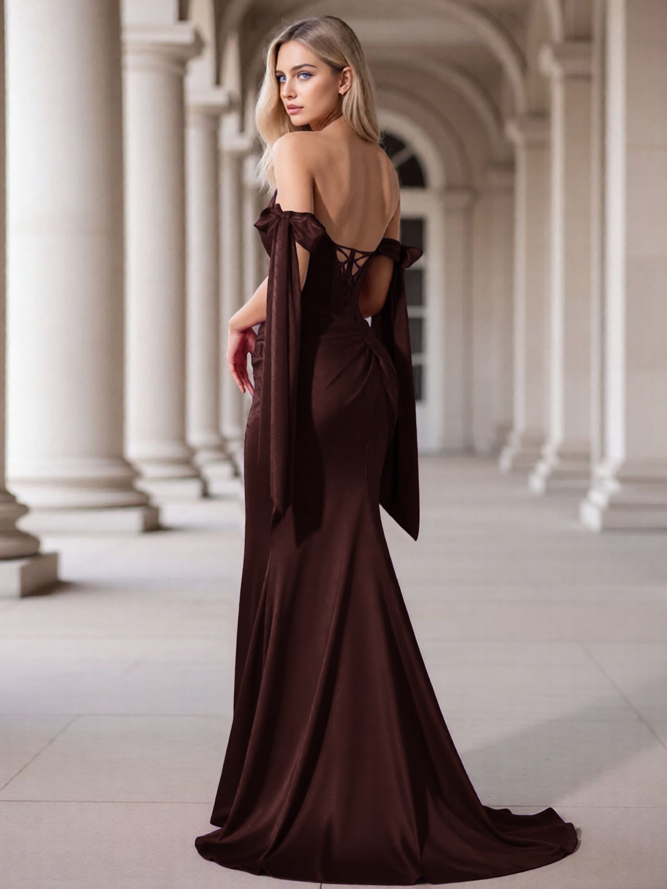 Details: Backless, Fitted Waist, Lace Up, Split, Draped, Pleated, Off Shoulder, Bow