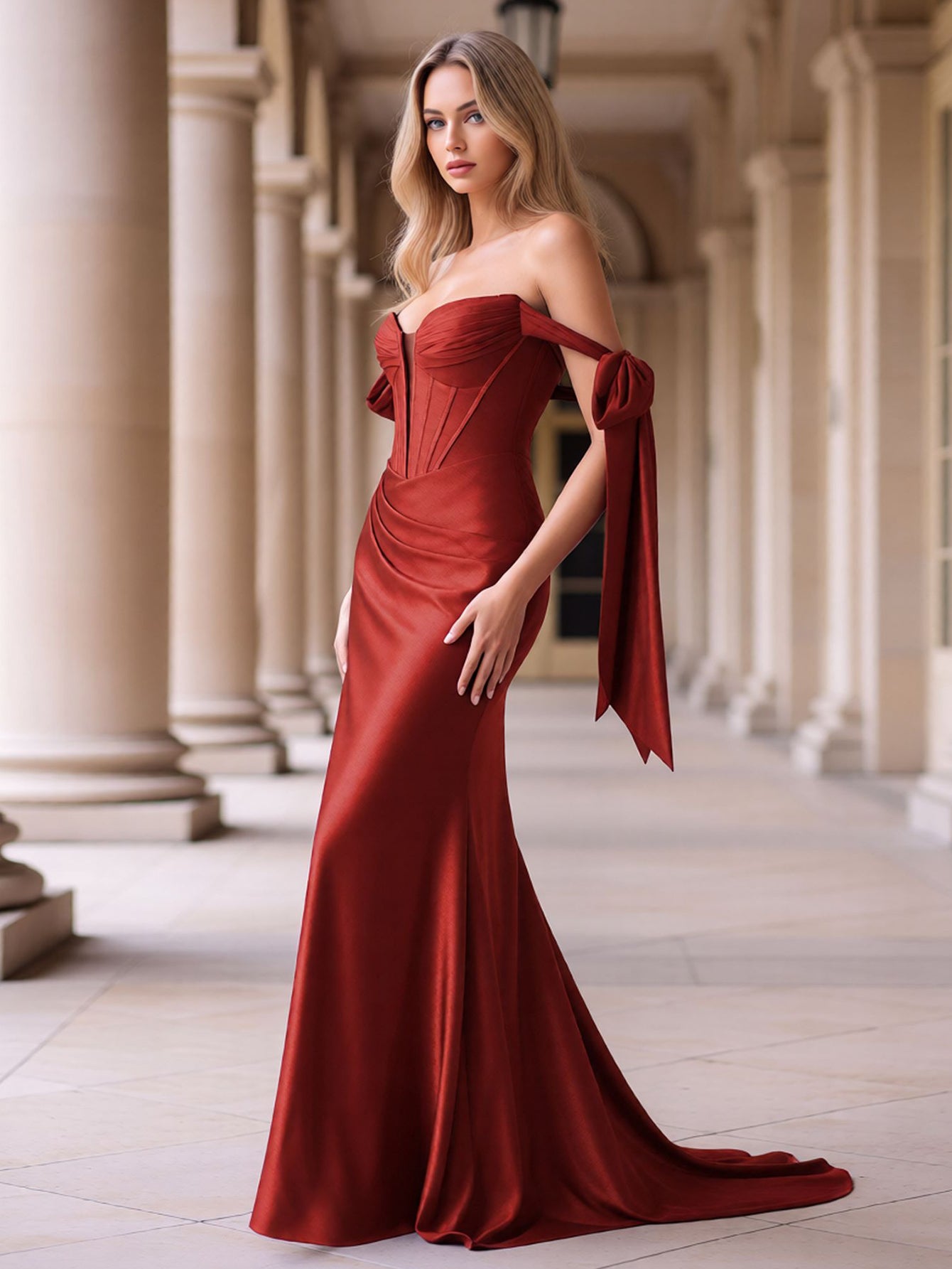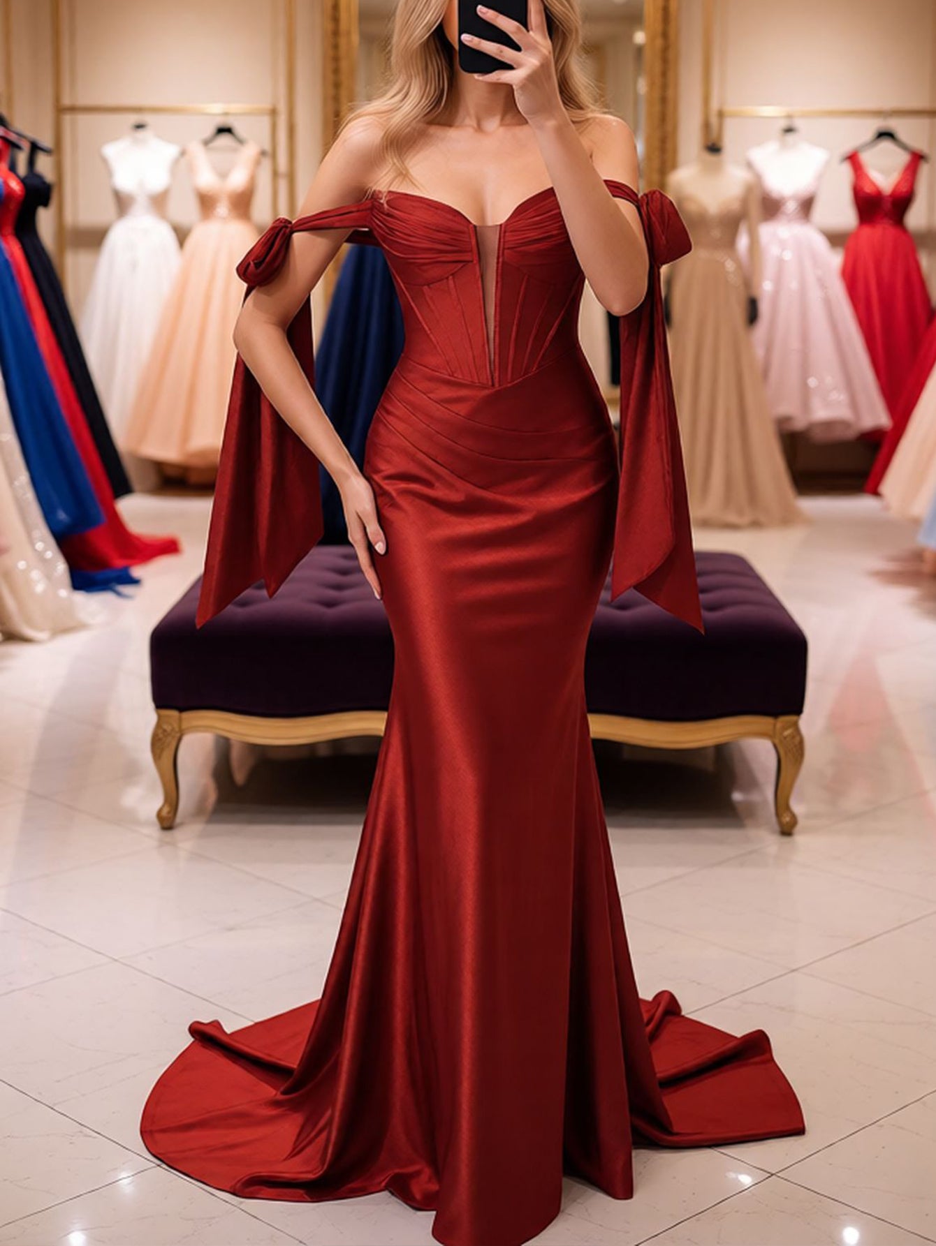 Off Shoulder Lace Up Bow Trumpet Prom Dress - Red