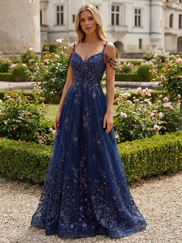 Off Shoulder Appliques Lace Up Long Ball Gown Prom Dress in Navy Blue