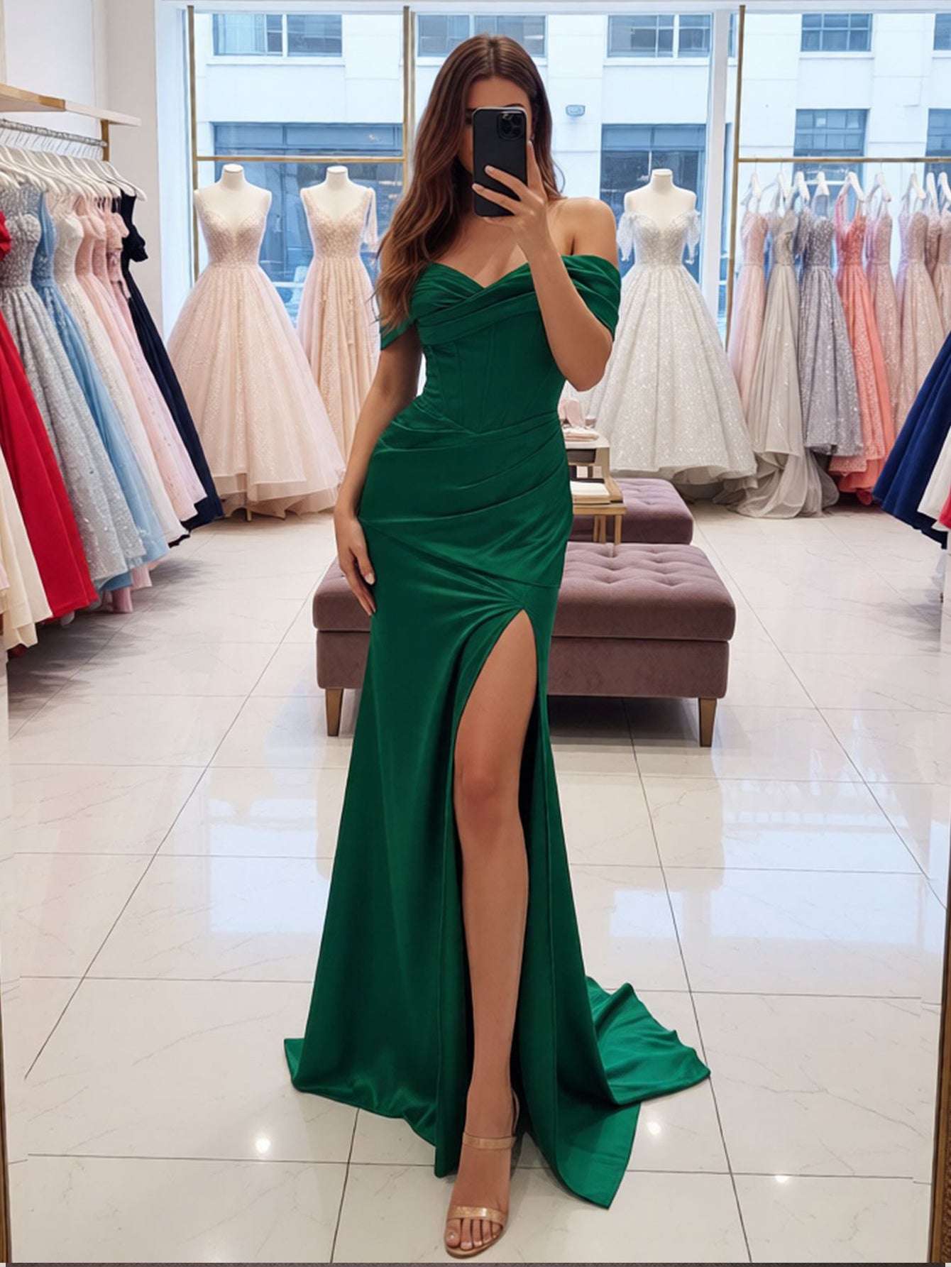 Off Shoulder Mermaid Prom Dress Long With Split - Emerald Green