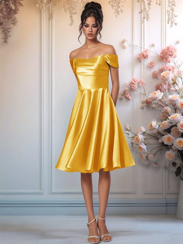 Off Shoulder Pleated Knee Length Bridesmaid Dress - Marigold