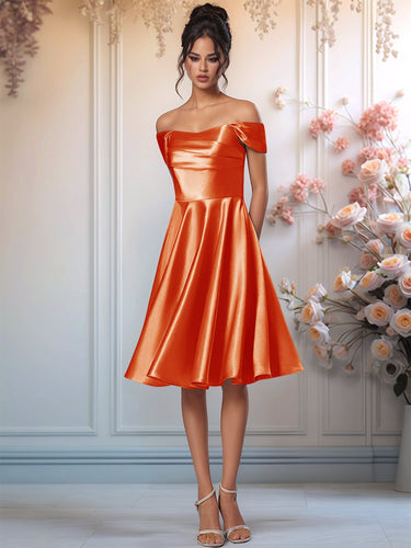 Off Shoulder Pleated Knee Length Bridesmaid Dress - Orange