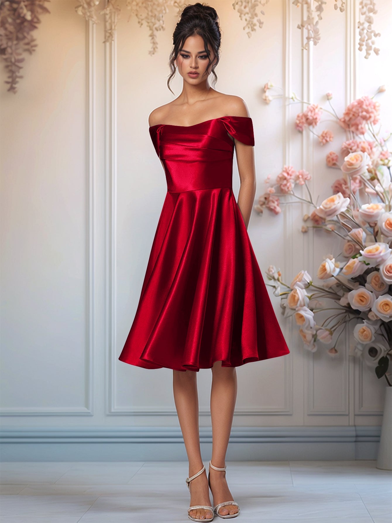 Off Shoulder Pleated Knee Length Bridesmaid Dress - Red