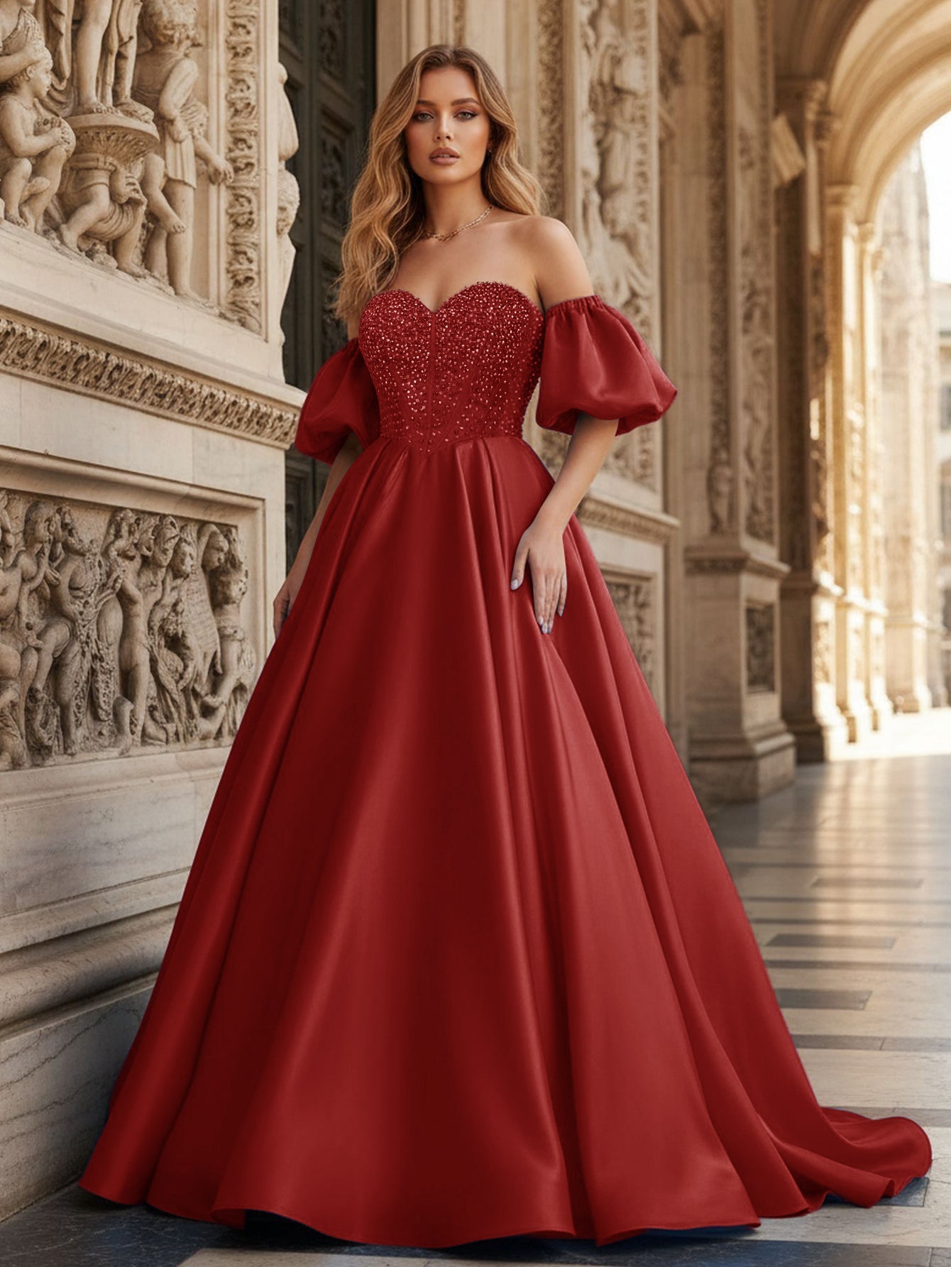 Off Shoulder Puff Sleeve Hot Fix Ball Gown Prom Dress - Red
