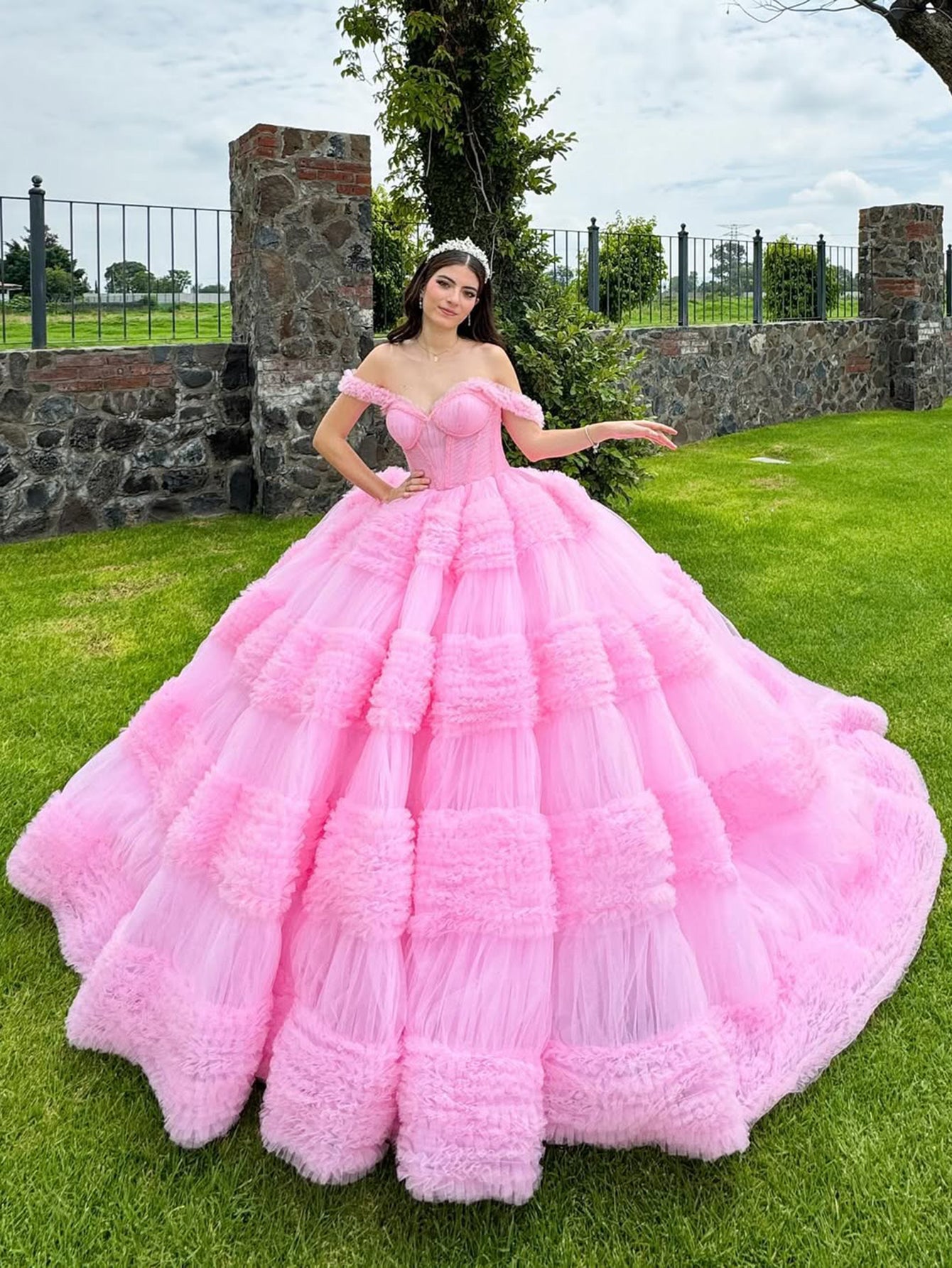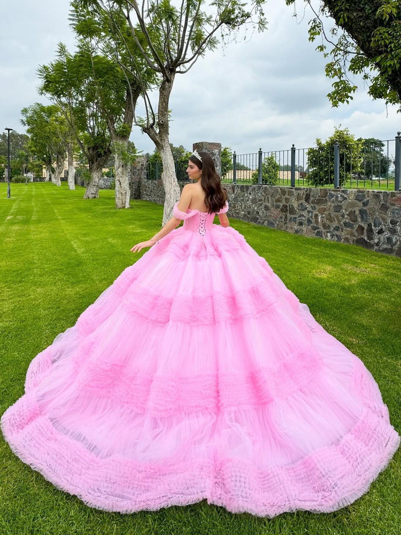 Off Shoulder Ruched Beading Lace Up Bodice Ball Gown Long Quinceanera Princess Dress - Pink