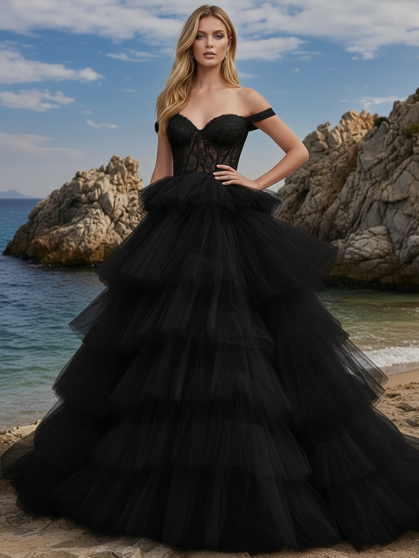 Off Shoulder Ruffled Tiered Lace Embroidery Tulle Ball Gown Prom Dress - Black
