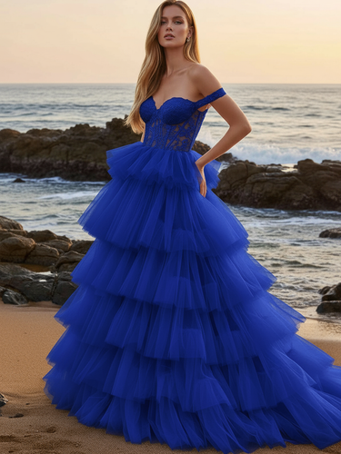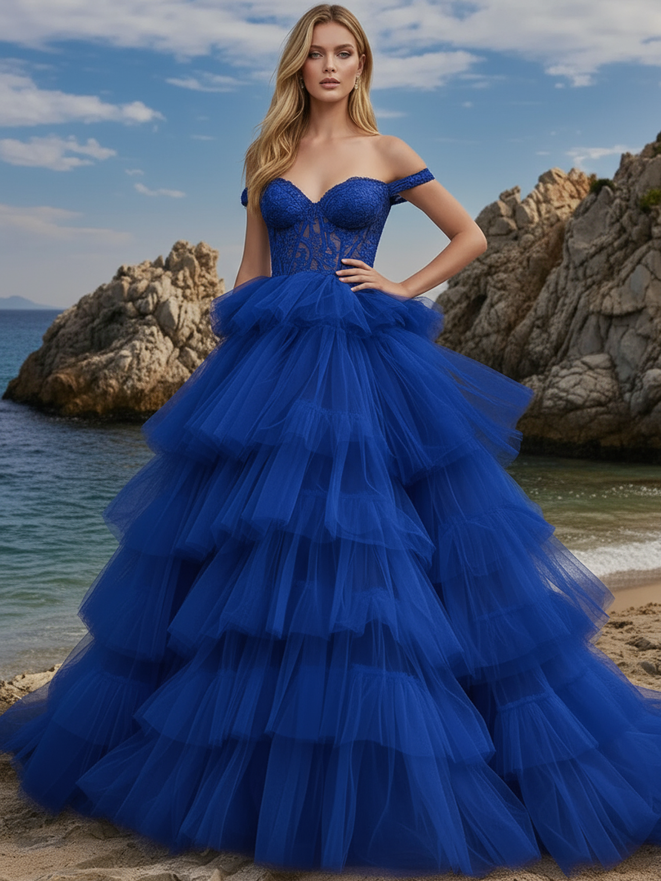 Off Shoulder Ruffled Tiered Lace Embroidery Tulle Ball Gown Prom Dress - Royal Blue