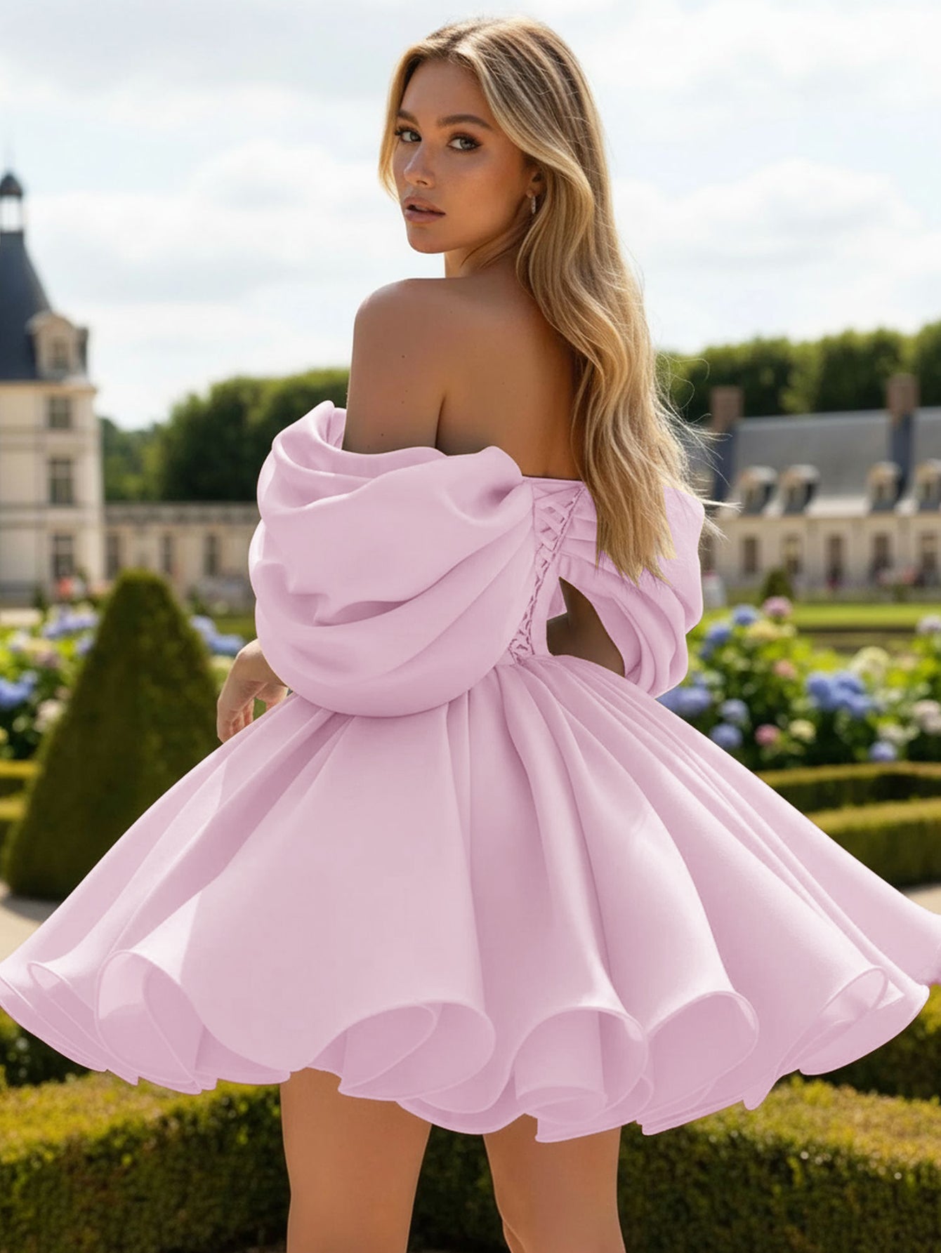Off Shoulder Satin Bodice Mini Ball Gown Prom Dress - Pink