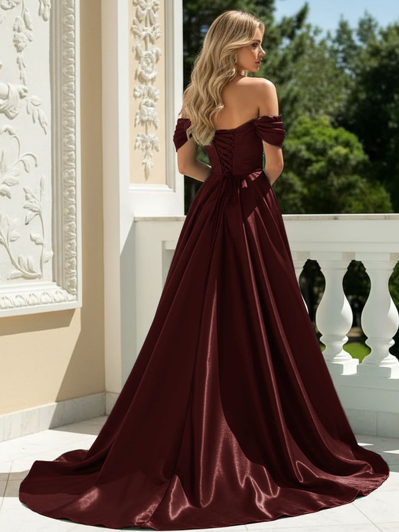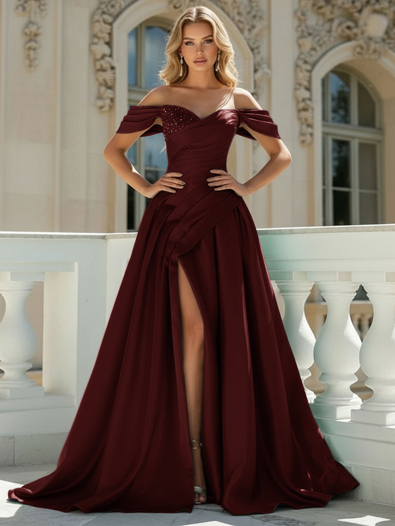 Off Shoulder Sequin Pleated Satin A-Line Prom Dress Long With Split - Burgundy