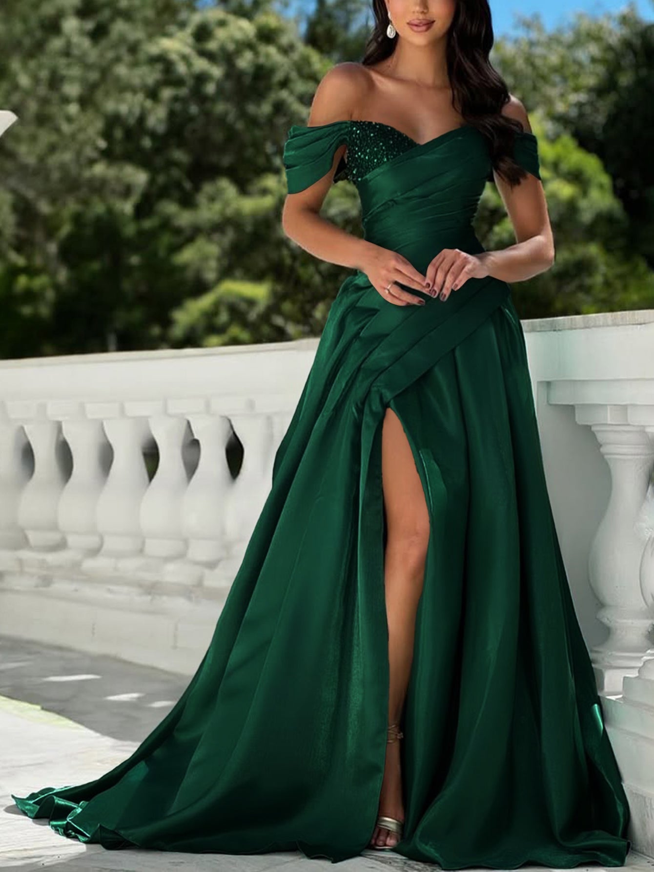 Off Shoulder Sequin Pleated Satin A-Line Prom Dress Long With Split - Emerald Green