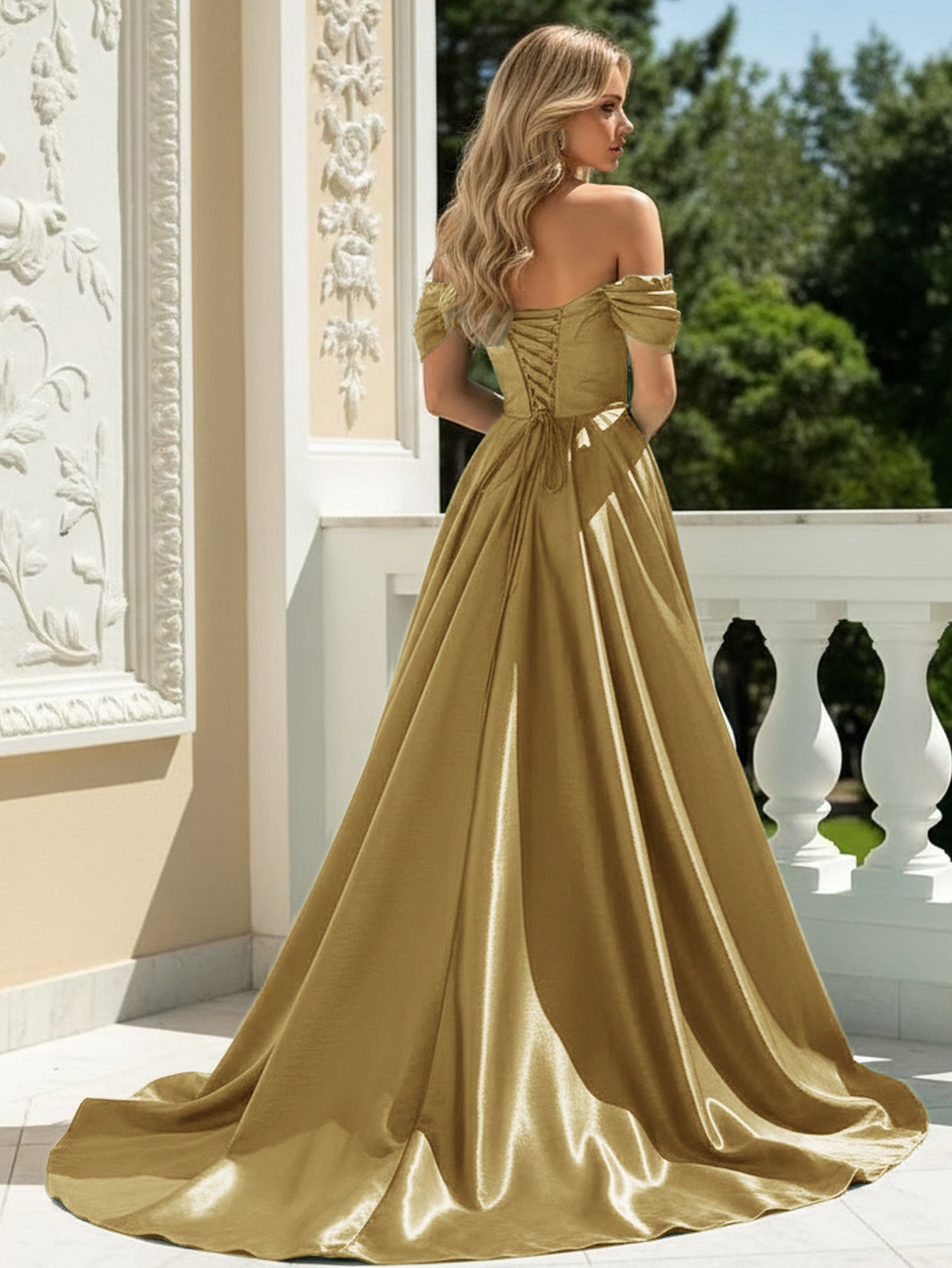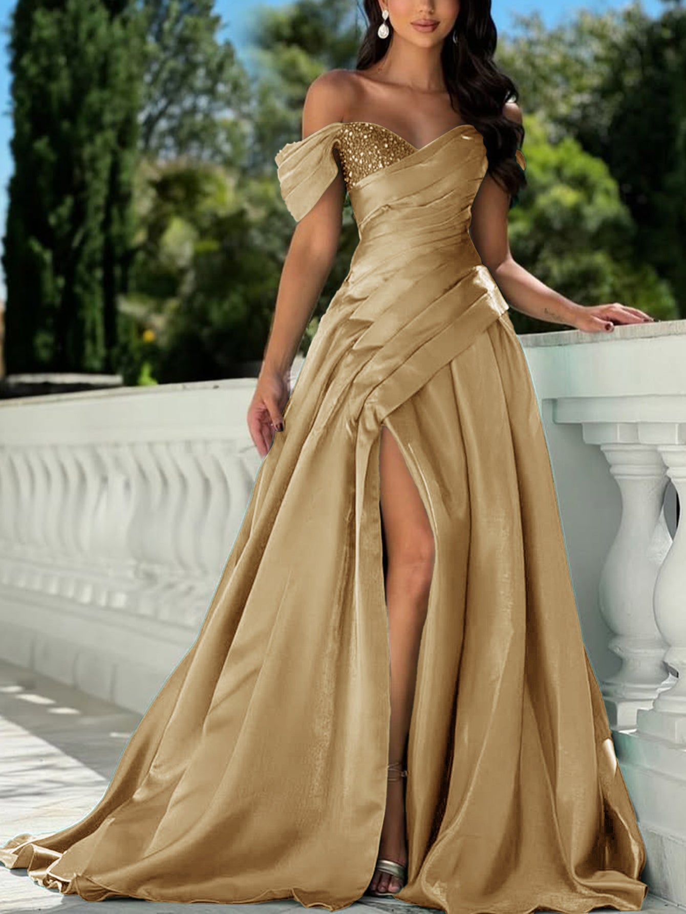 Off Shoulder Sequin Pleated Satin A-Line Prom Dress Long With Split - Gold