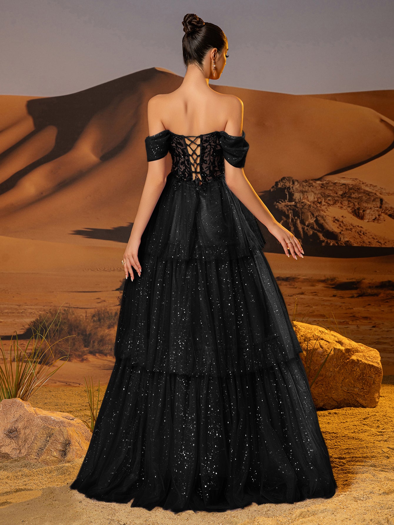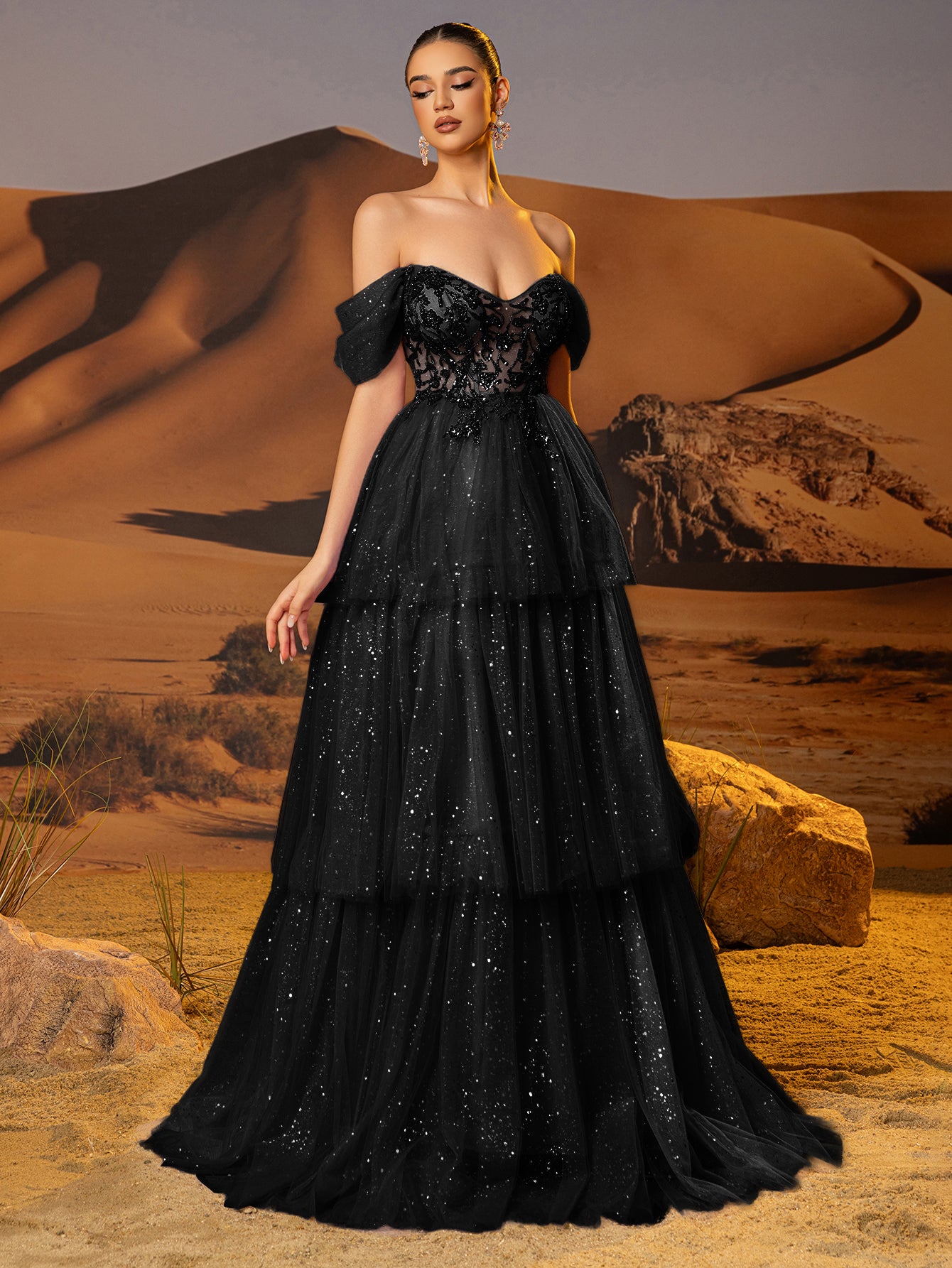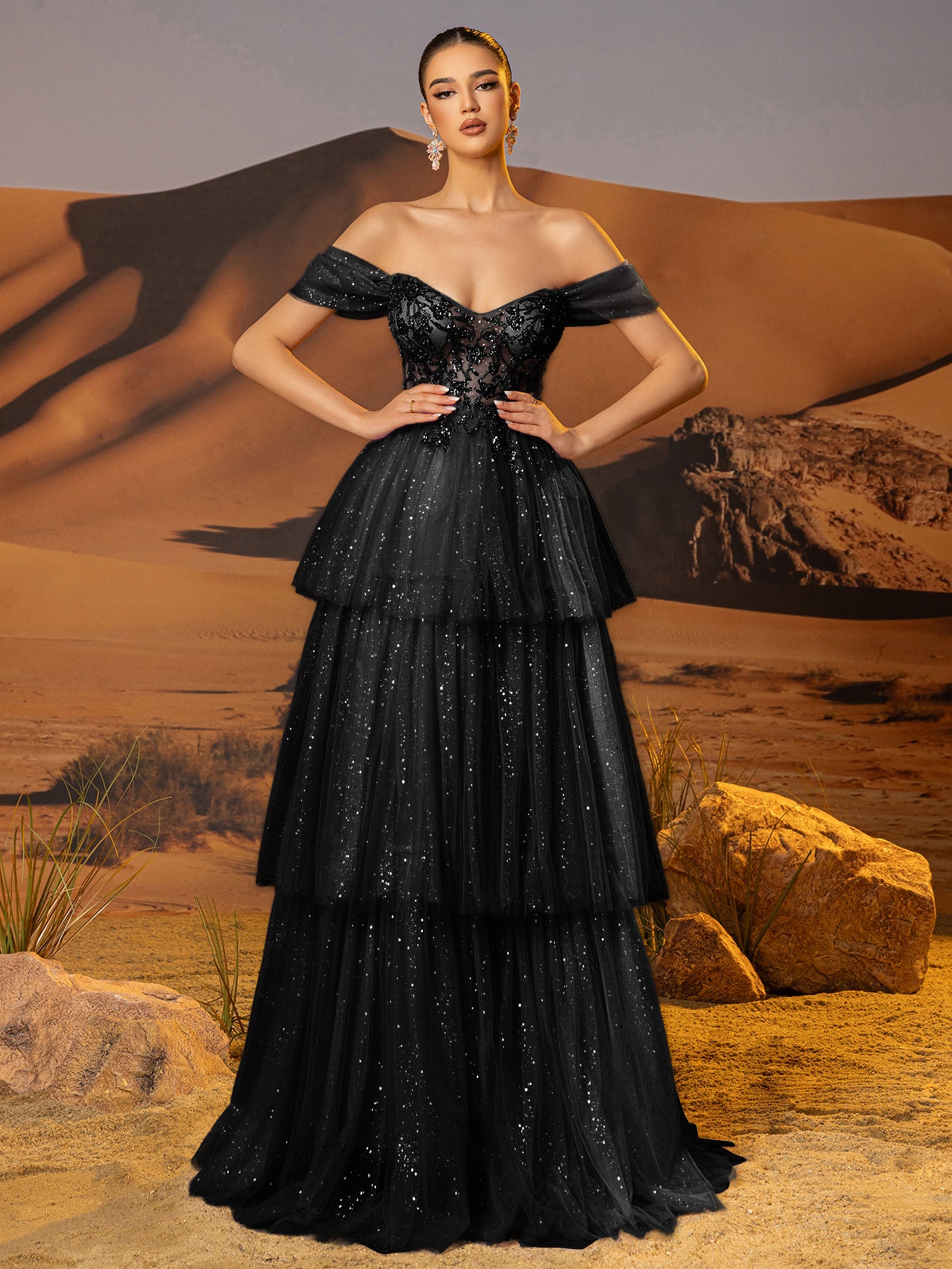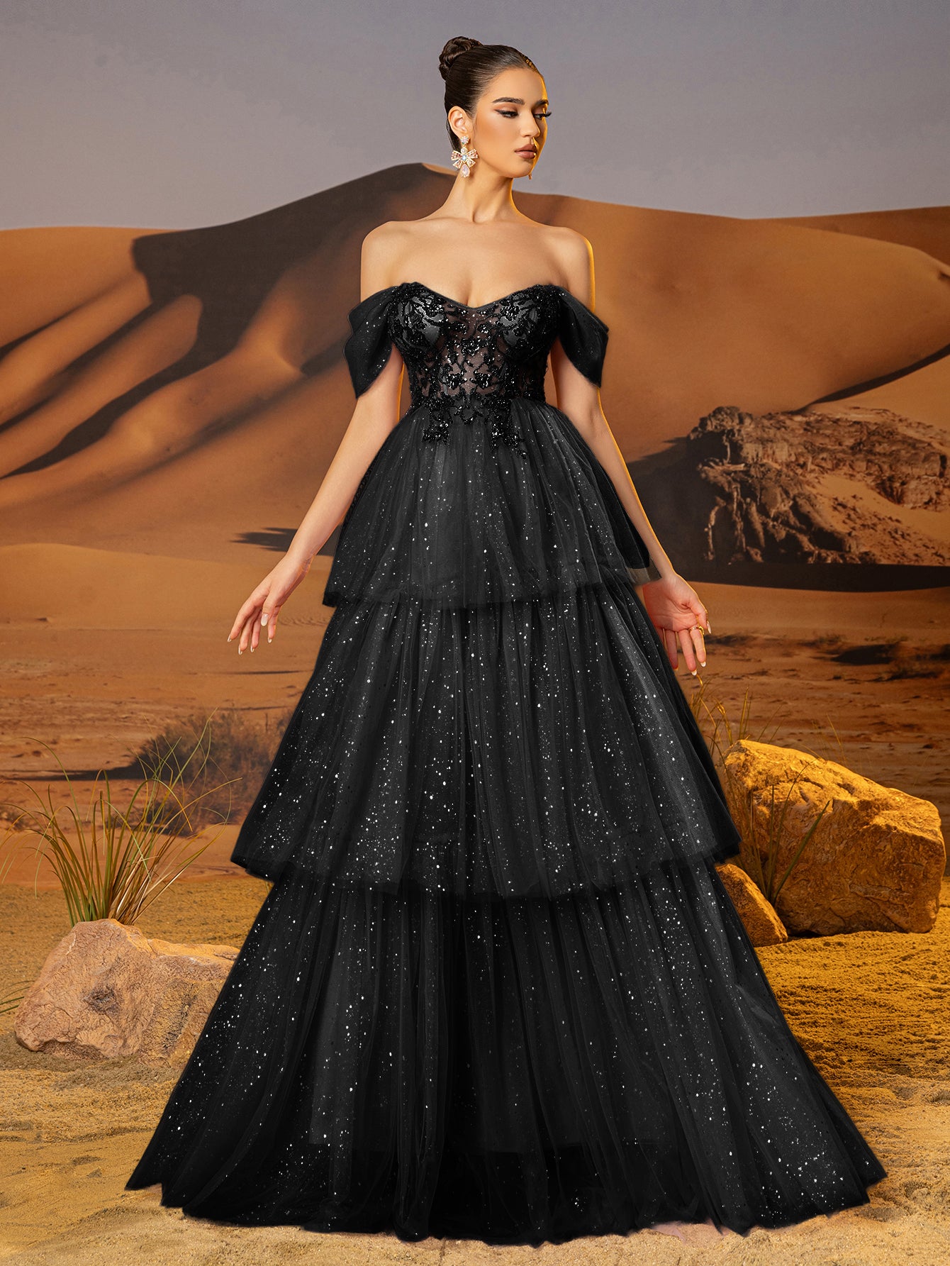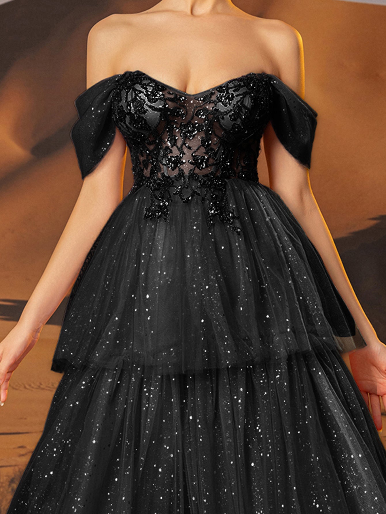 Off Shoulder Sparkly Lace Embroidery Layered Ball Gown Prom Dress - Black