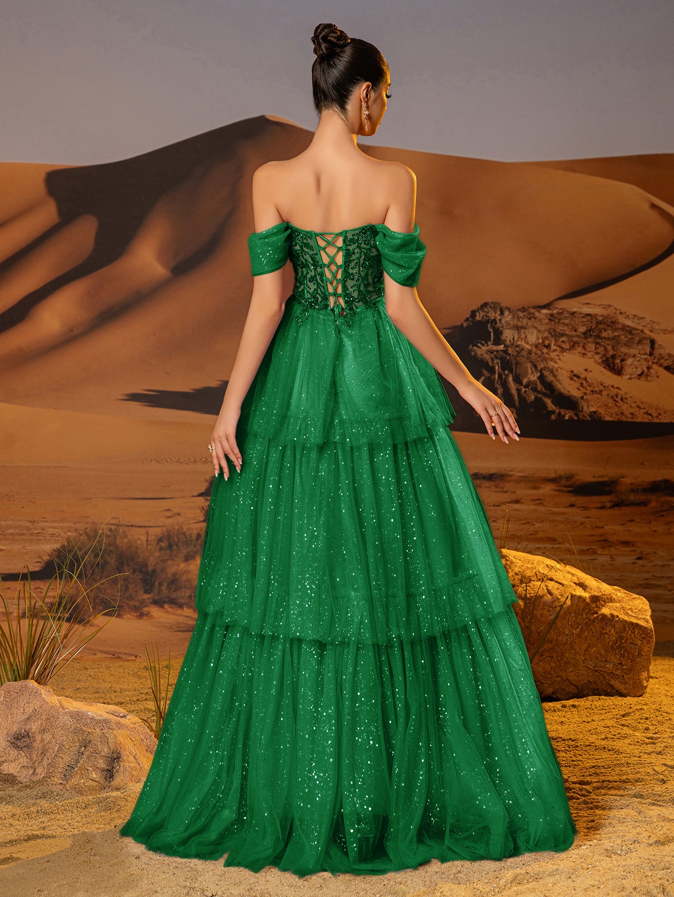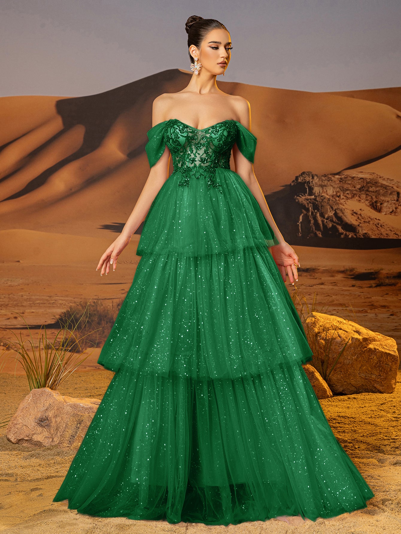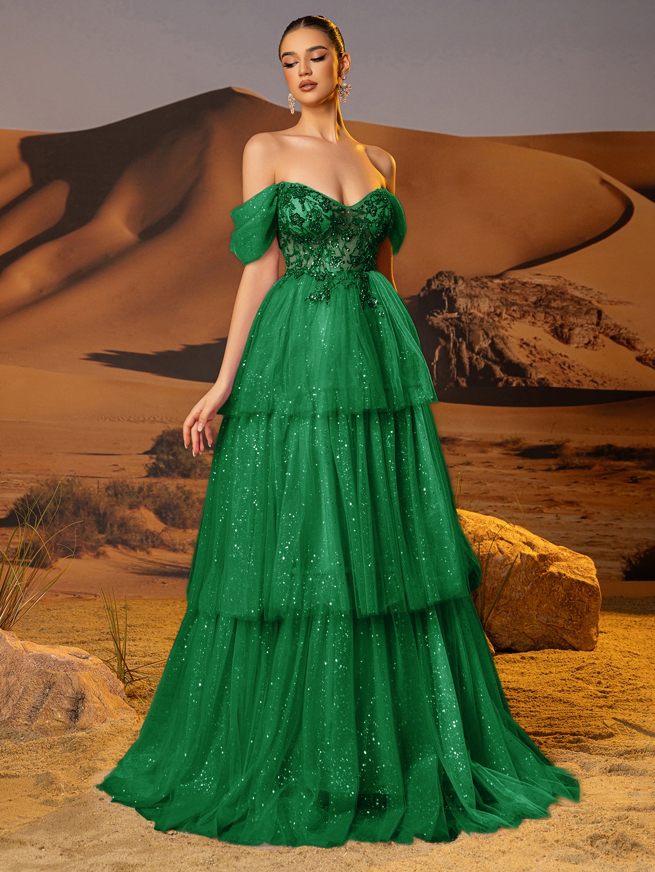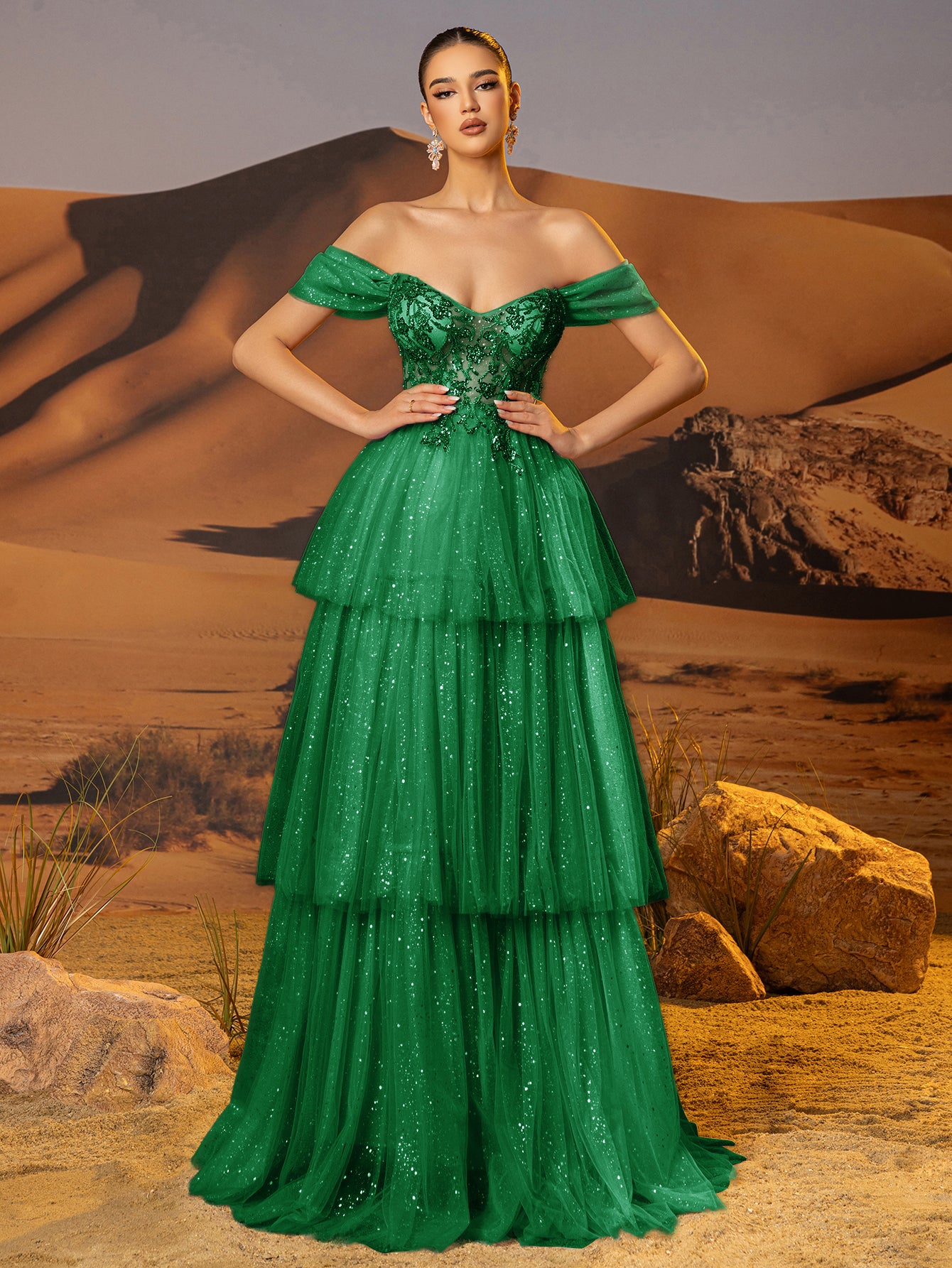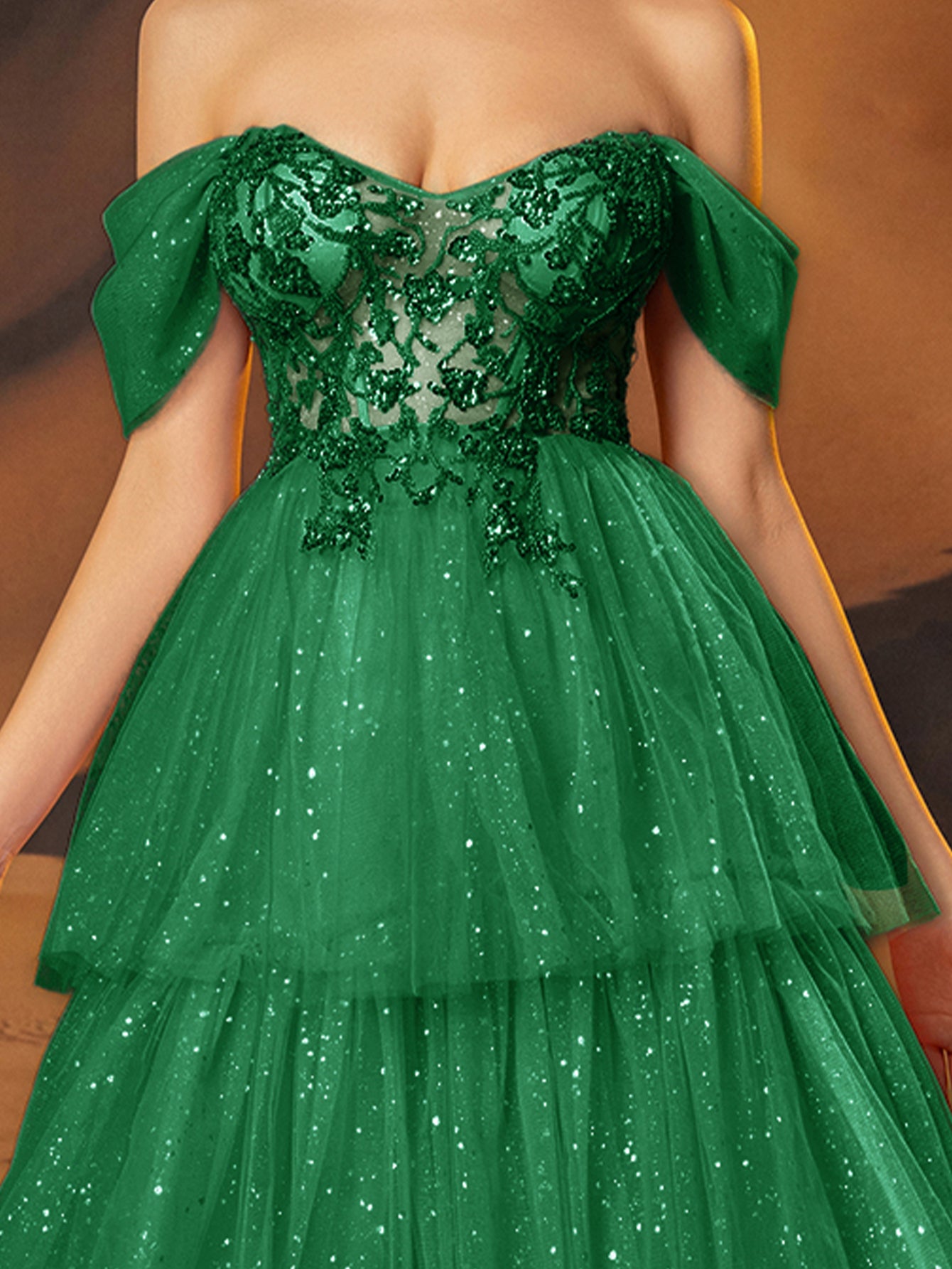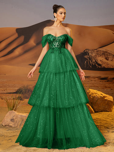 Off Shoulder Sparkly Lace Embroidery Layered Ball Gown Prom Dress - Emerald Green