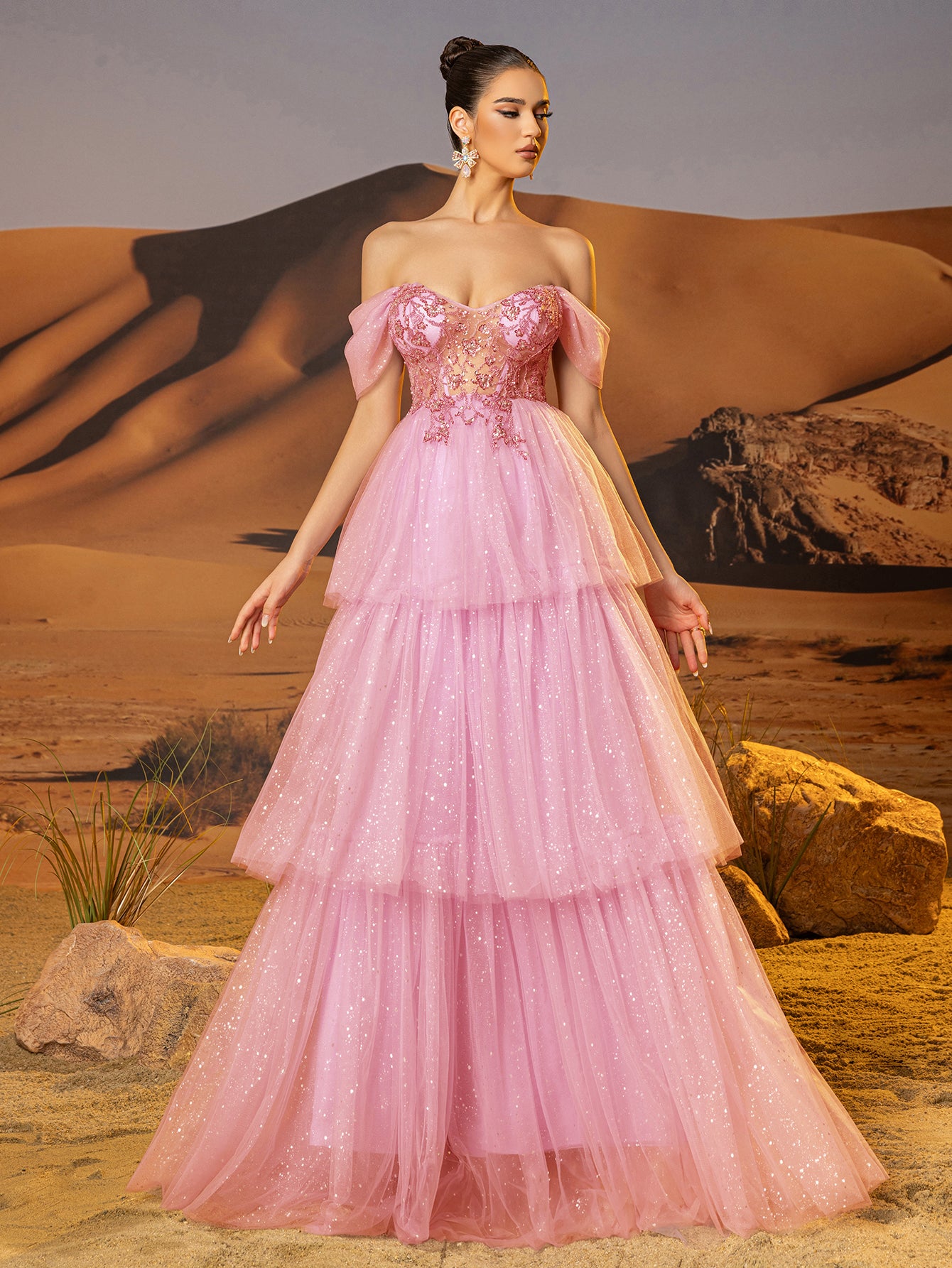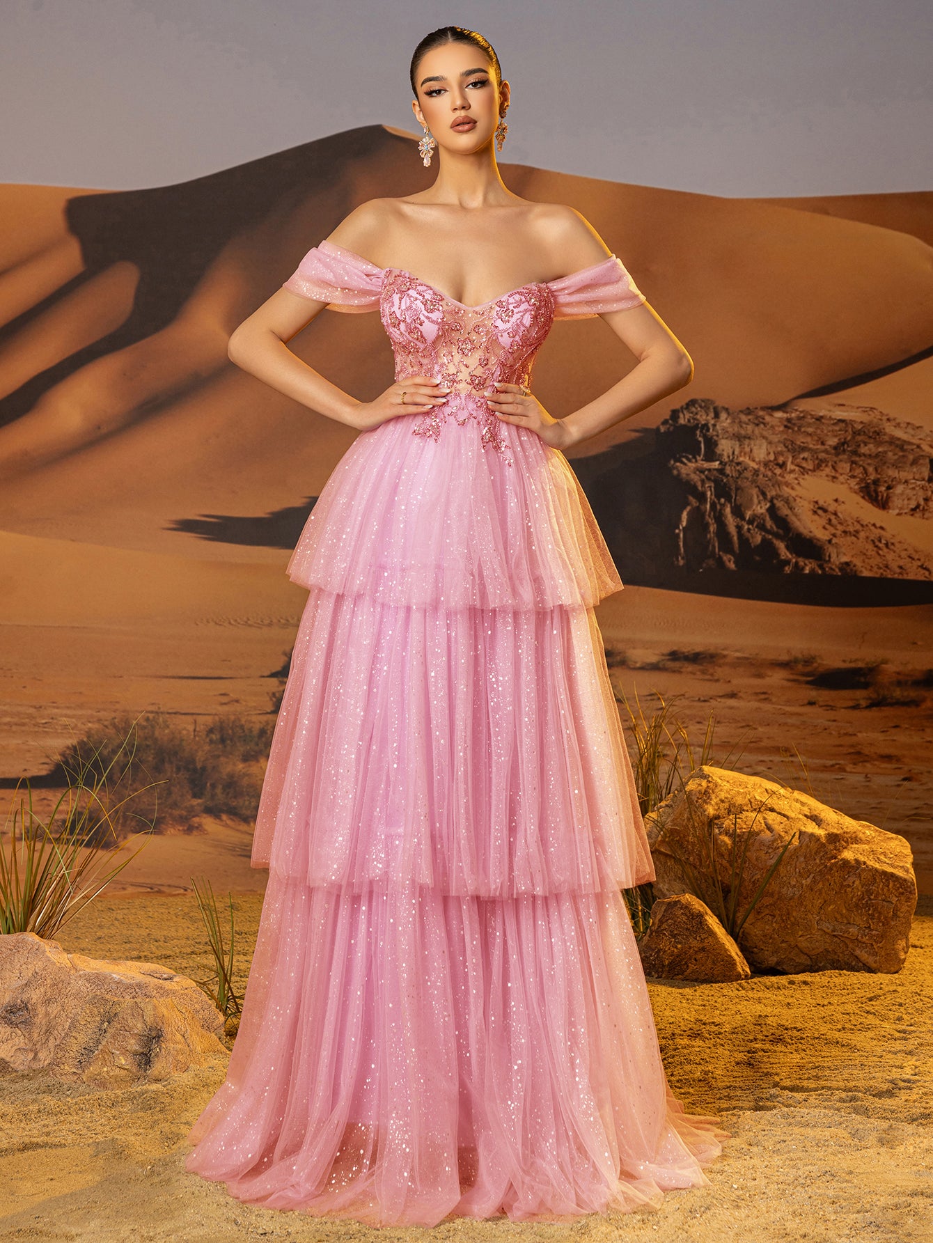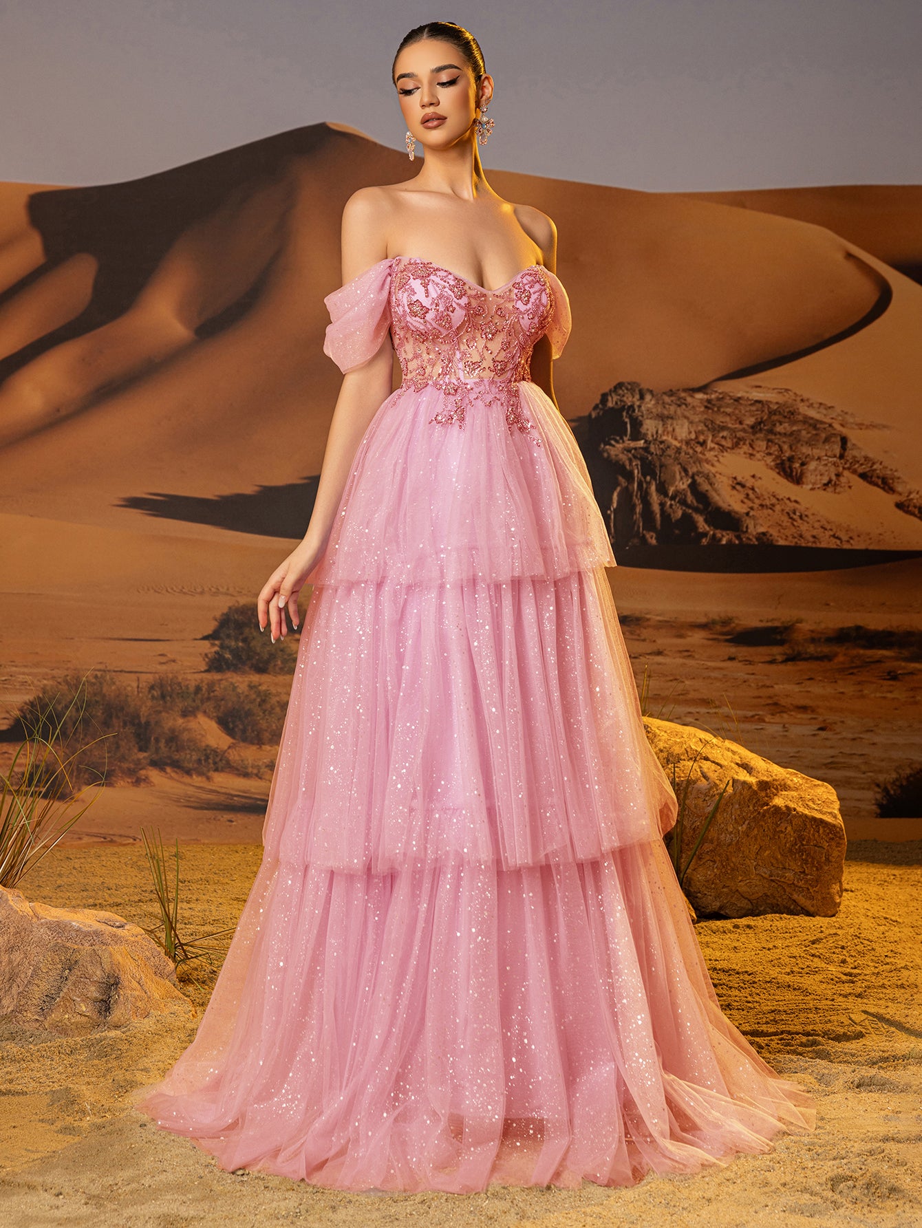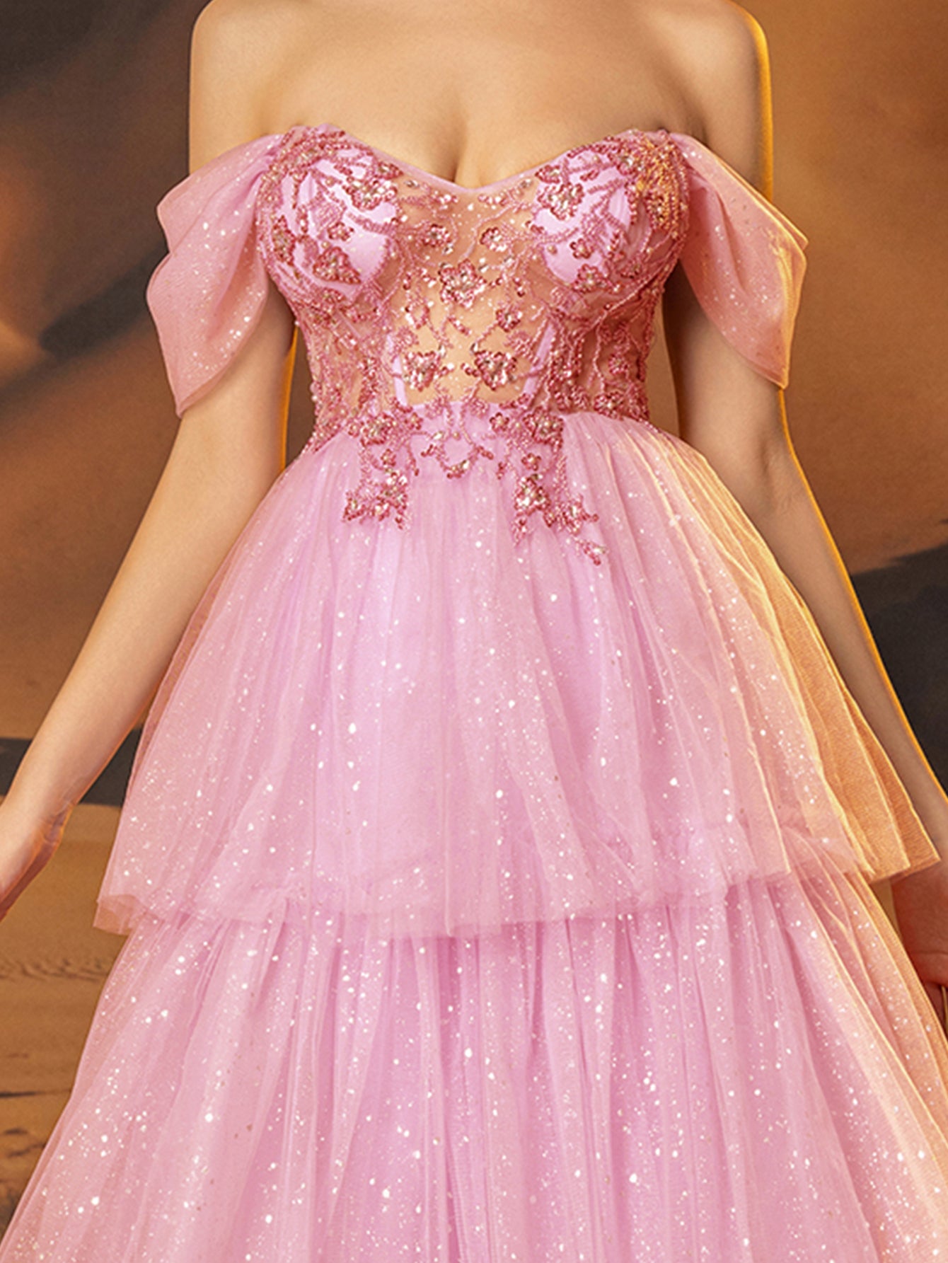 Off Shoulder Sparkly Lace Embroidery Layered Ball Gown Prom Dress - Pink