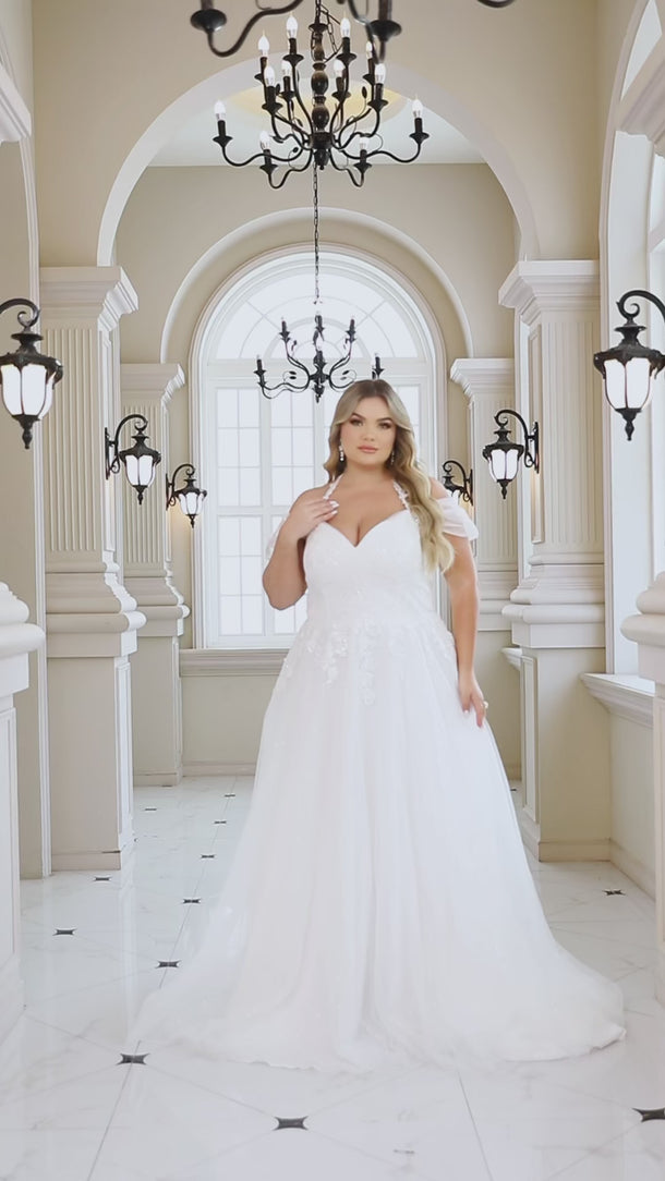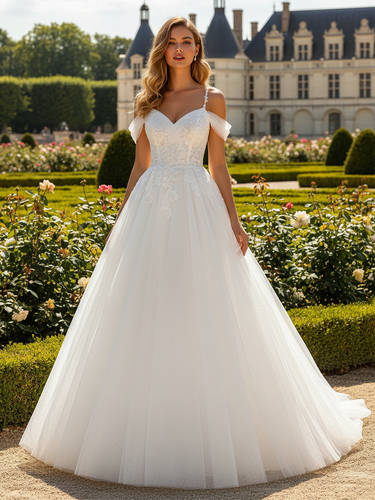 This tulle bridal dress features lace and embroidery on the bodice. The off shoulder wedding shower dress has a V-Neck and ball gown hem. The wedding dress for bridal guest is ideal for beach, outdoor wedding or garden wedding guest party.