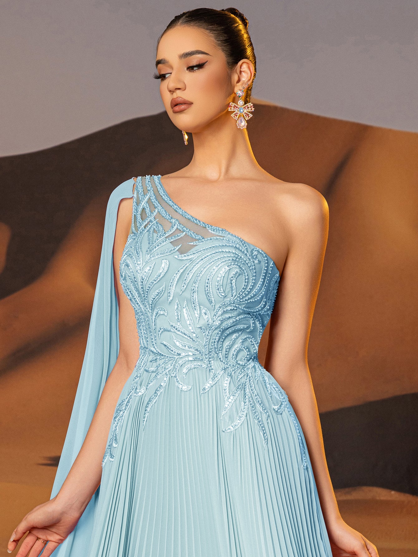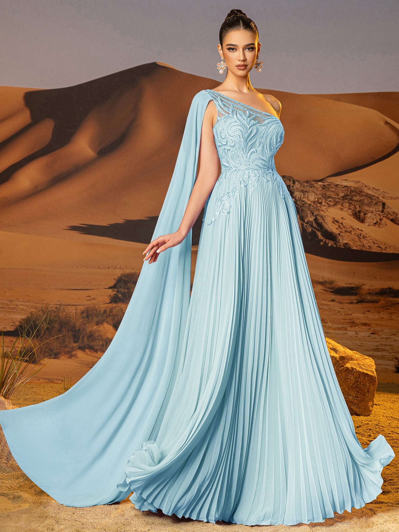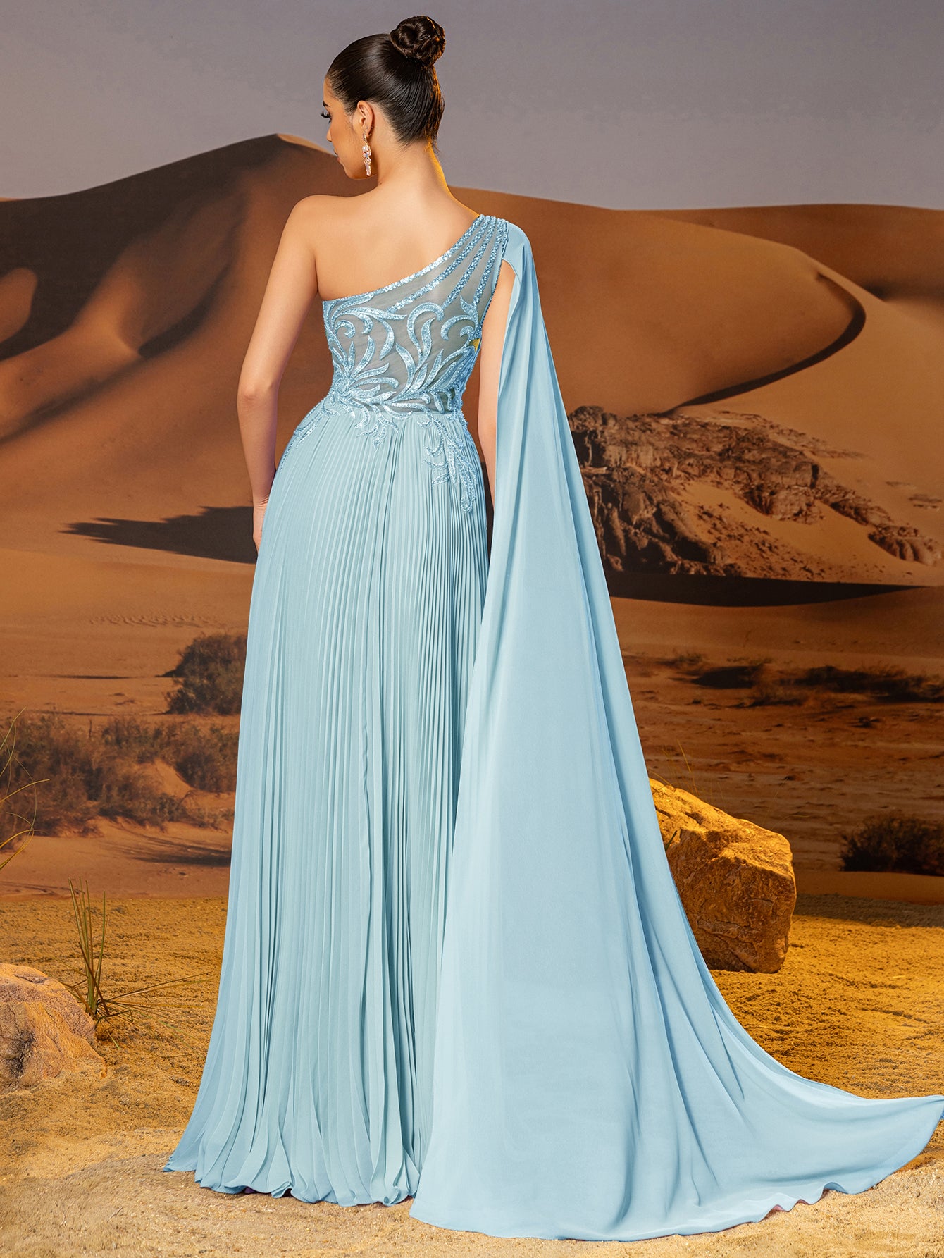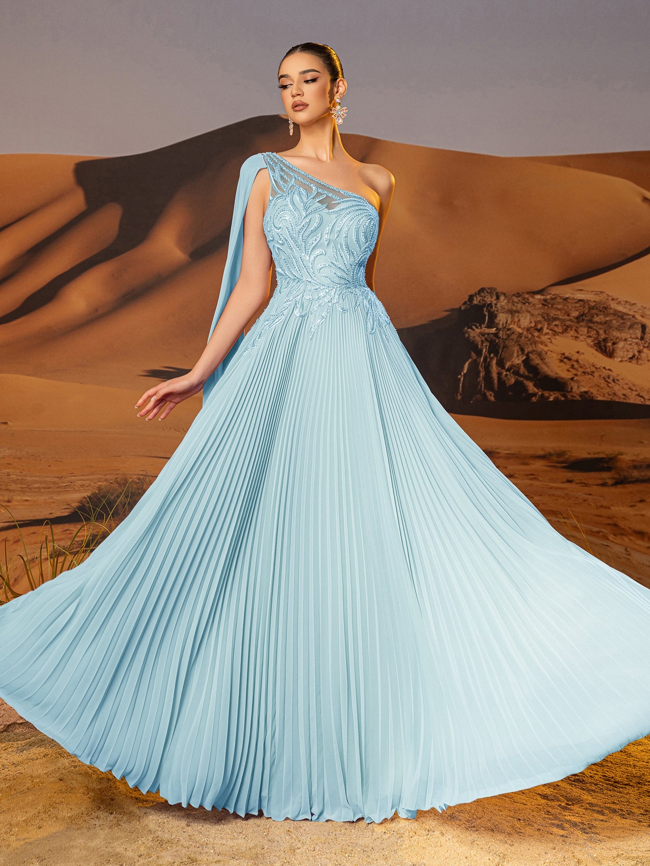 This chiffon gown features beaded embroidery and drop train on the bodice. The one shoulder dress for prom has a asymmetrical Neckline and pleated hem. This a-line dress for cocktail is ideal for party, evening or festivals.