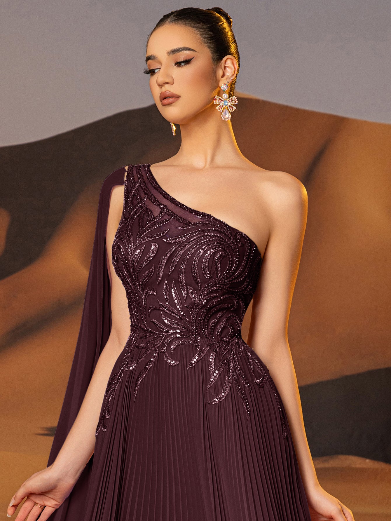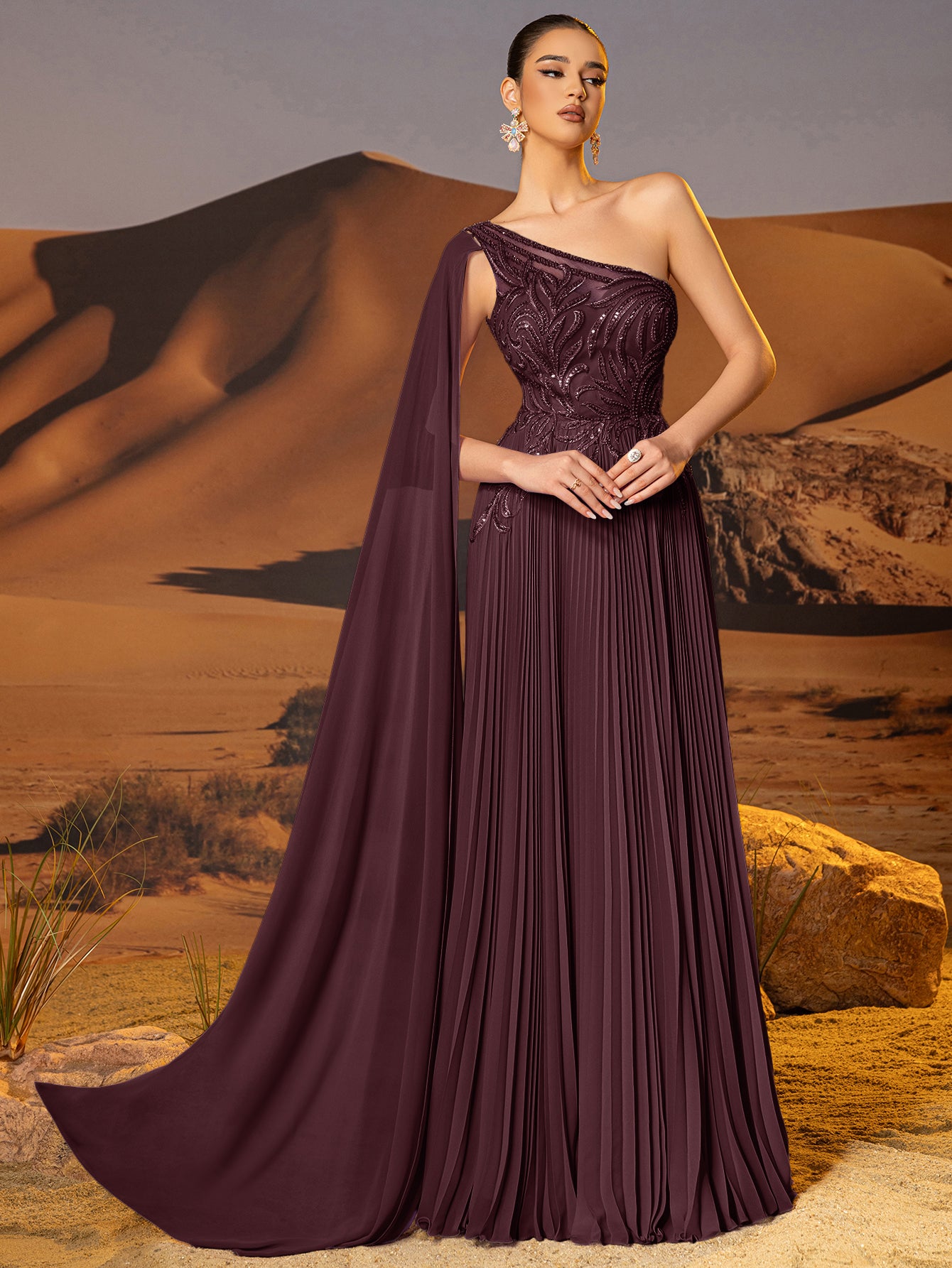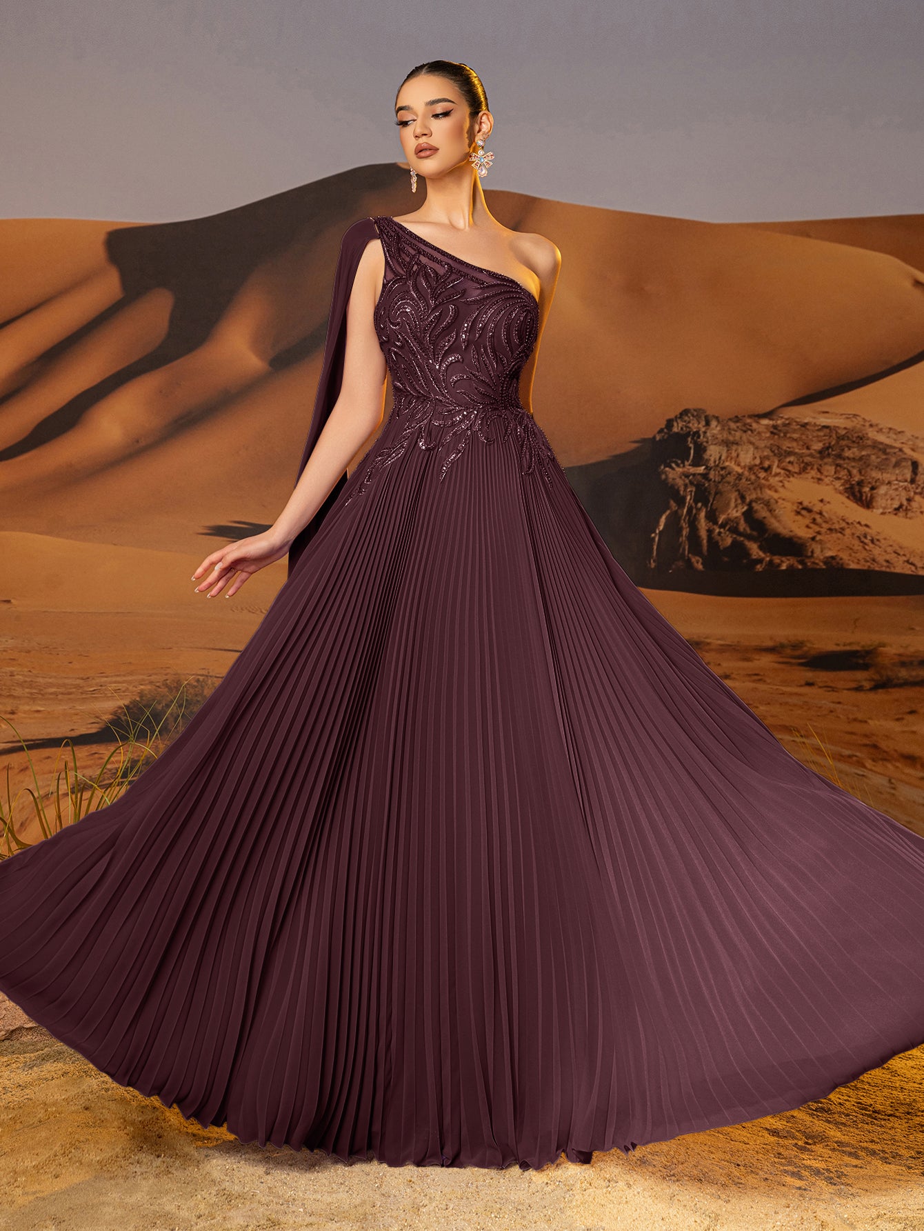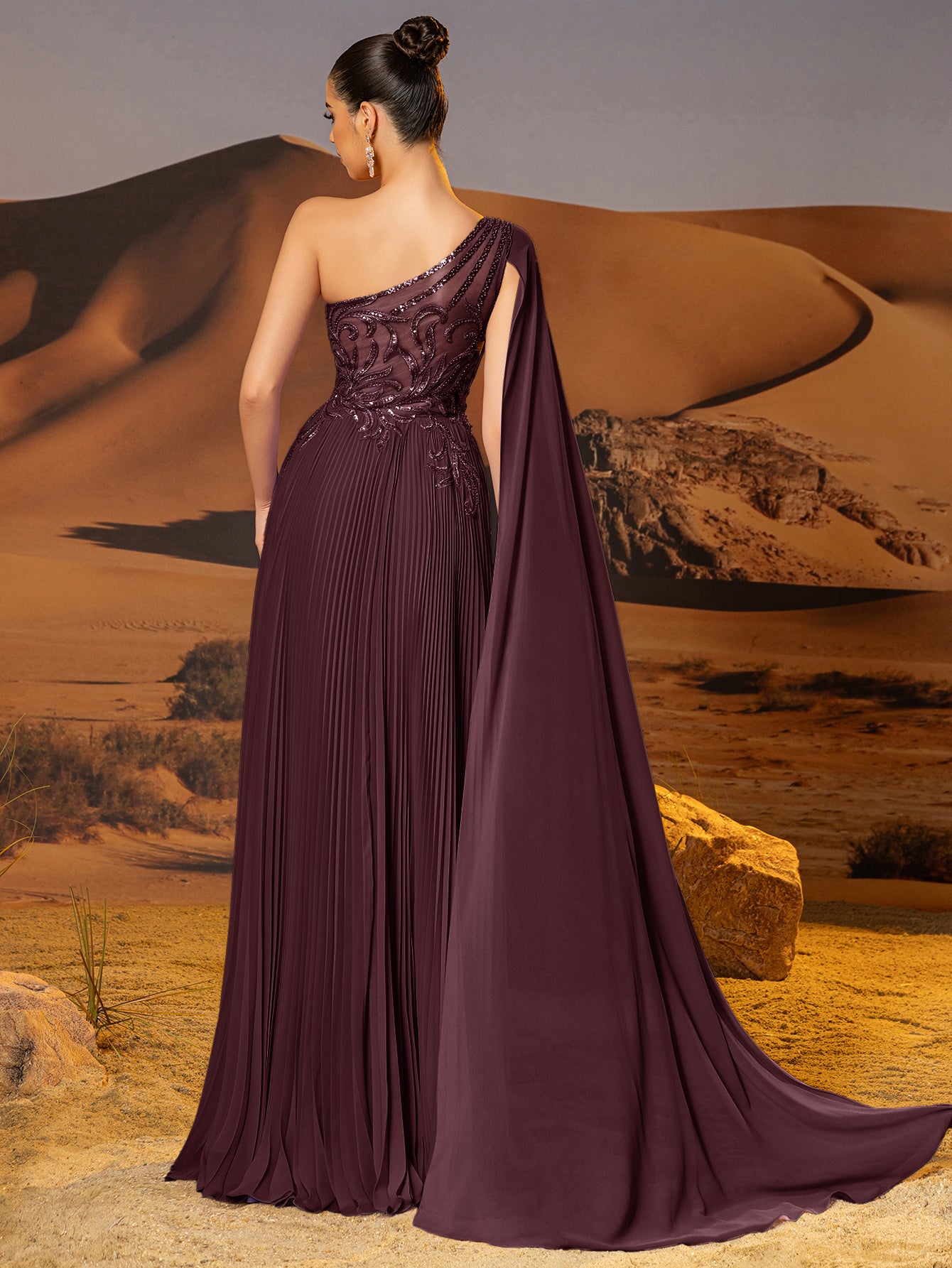 This chiffon gown features beaded embroidery and drop train on the bodice. The one shoulder dress for prom has a asymmetrical Neckline and pleated hem. This a-line dress for cocktail is ideal for party, evening or festivals.
