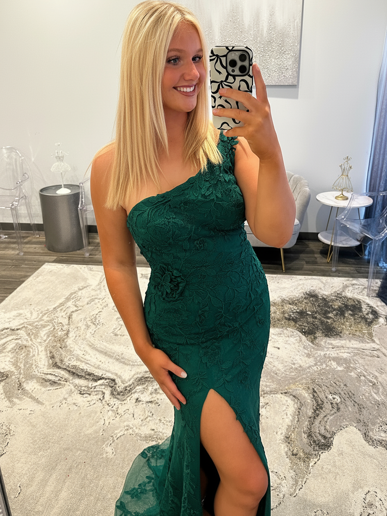 This lace prom gown features 3D Rose with lace on the bodice. The one-shoulder long dress has a split hem. This mermaid prom dress is ideal for party, evening or festivals.