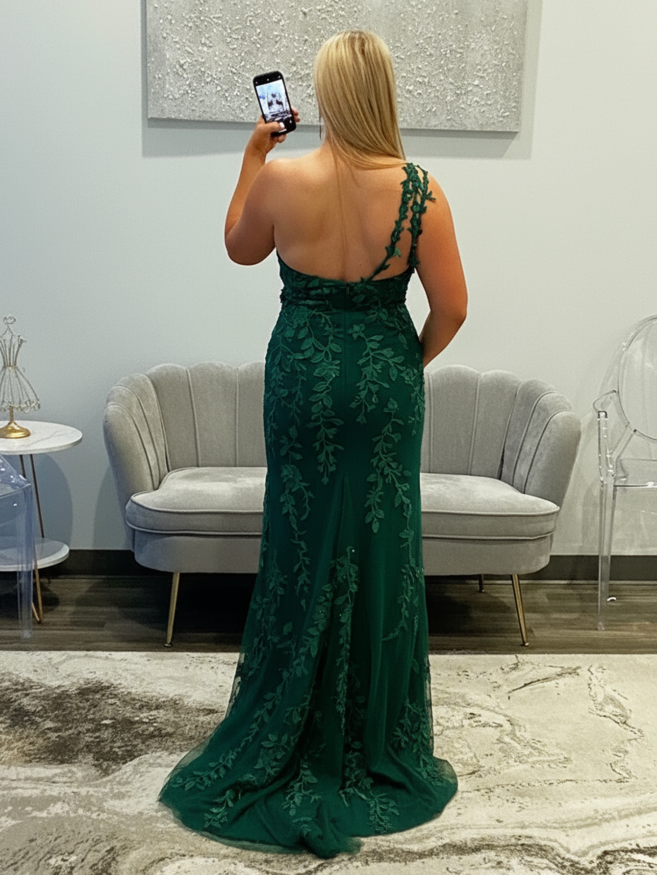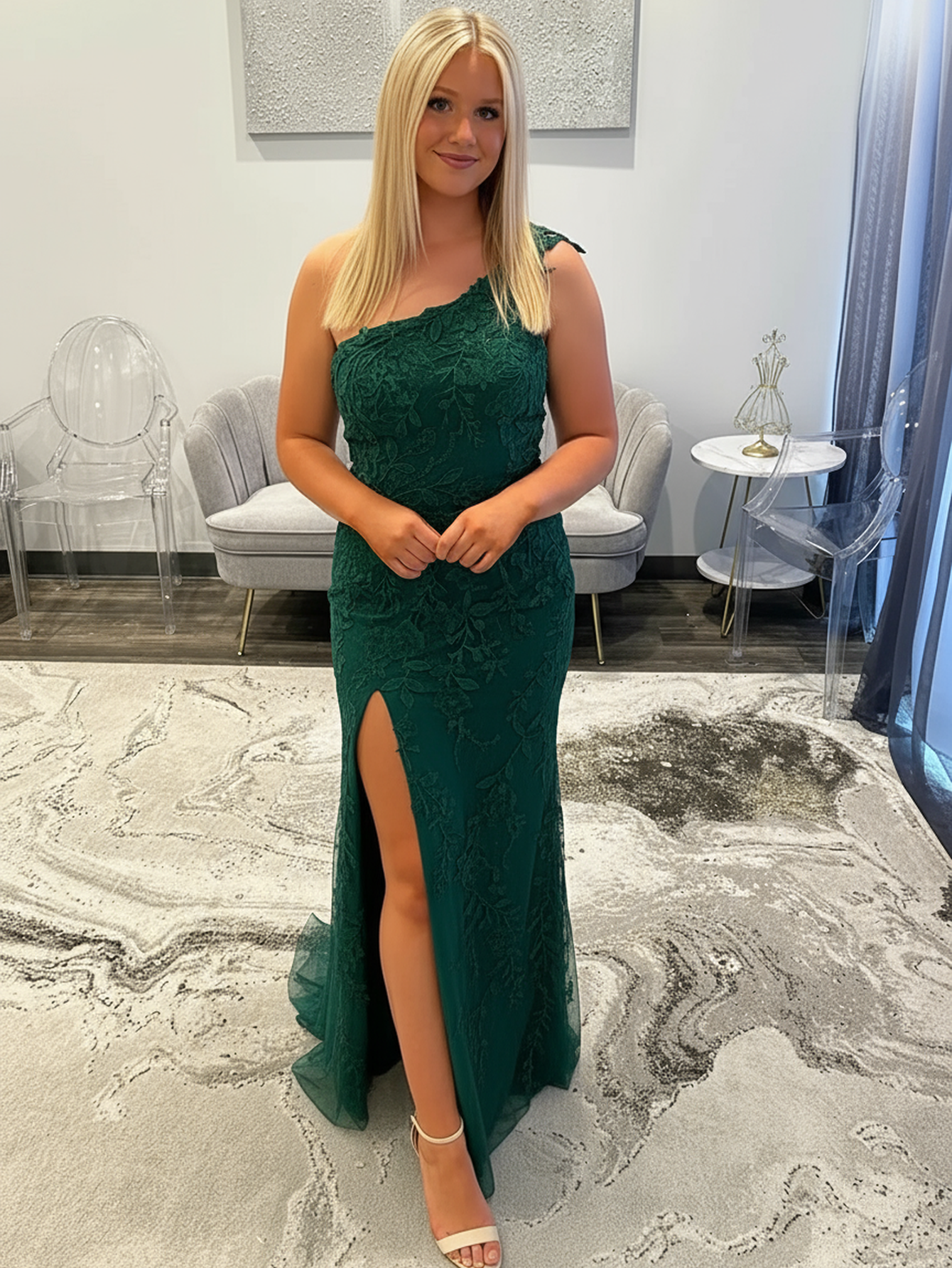 One Shoulder Lace 3D Rose Prom Dress With Slit - Emerald Green