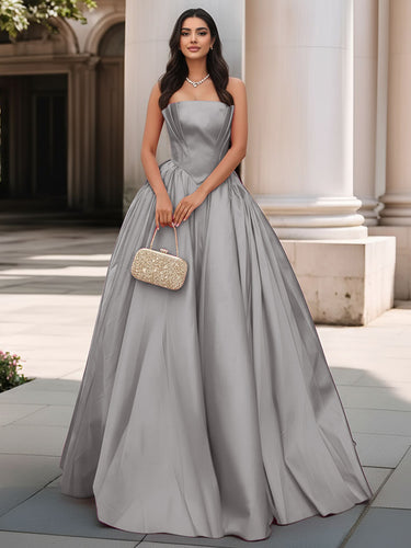 Pleated Bust Ruffle Hem Strapless Satin Prom Ball Gown - Silver