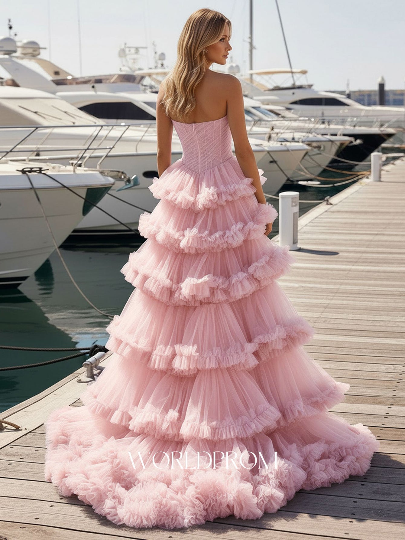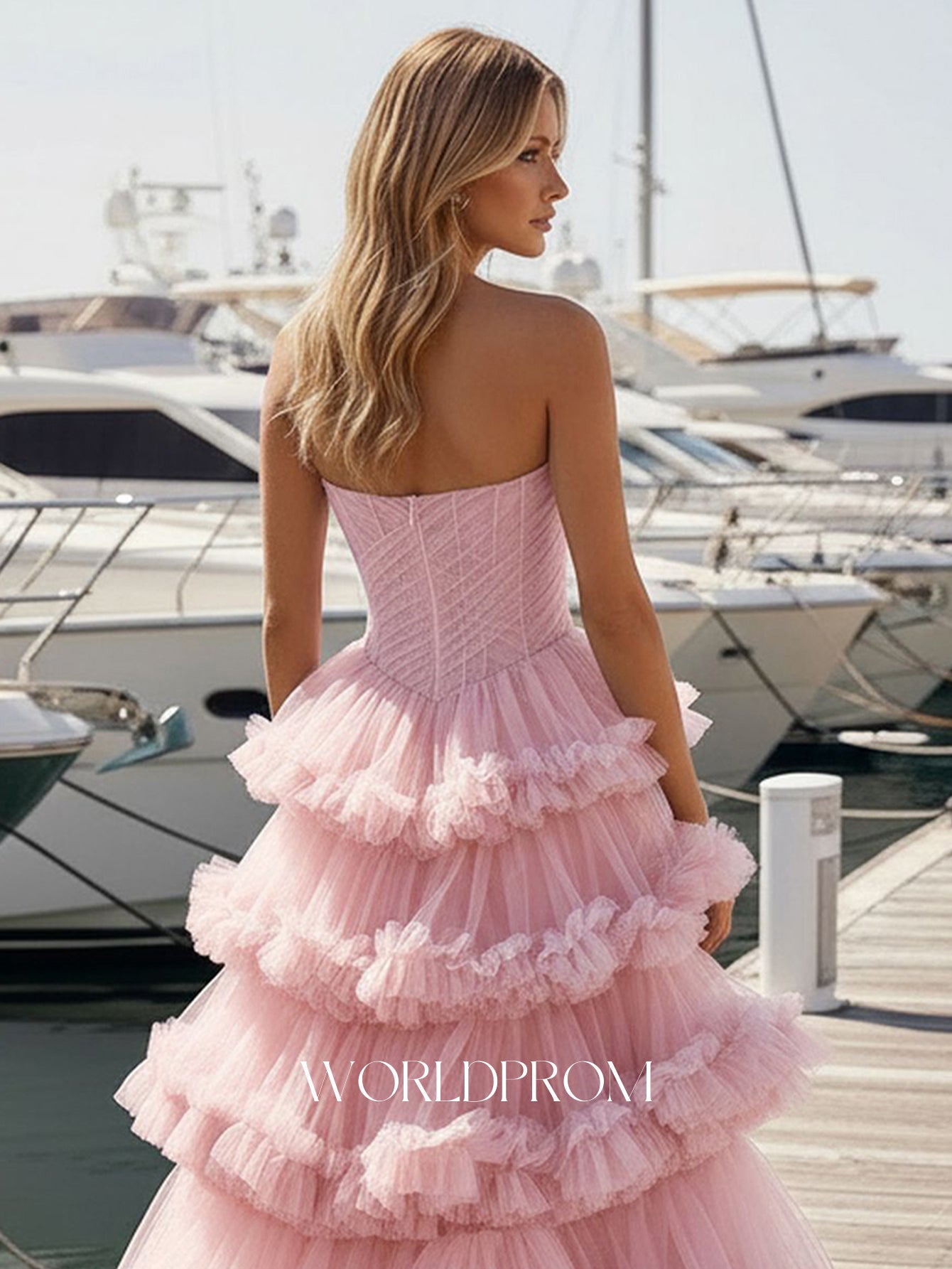 Pleated Sheer Corset Top Strapless Tiered Layered Ball Gown Prom Dress - Pink