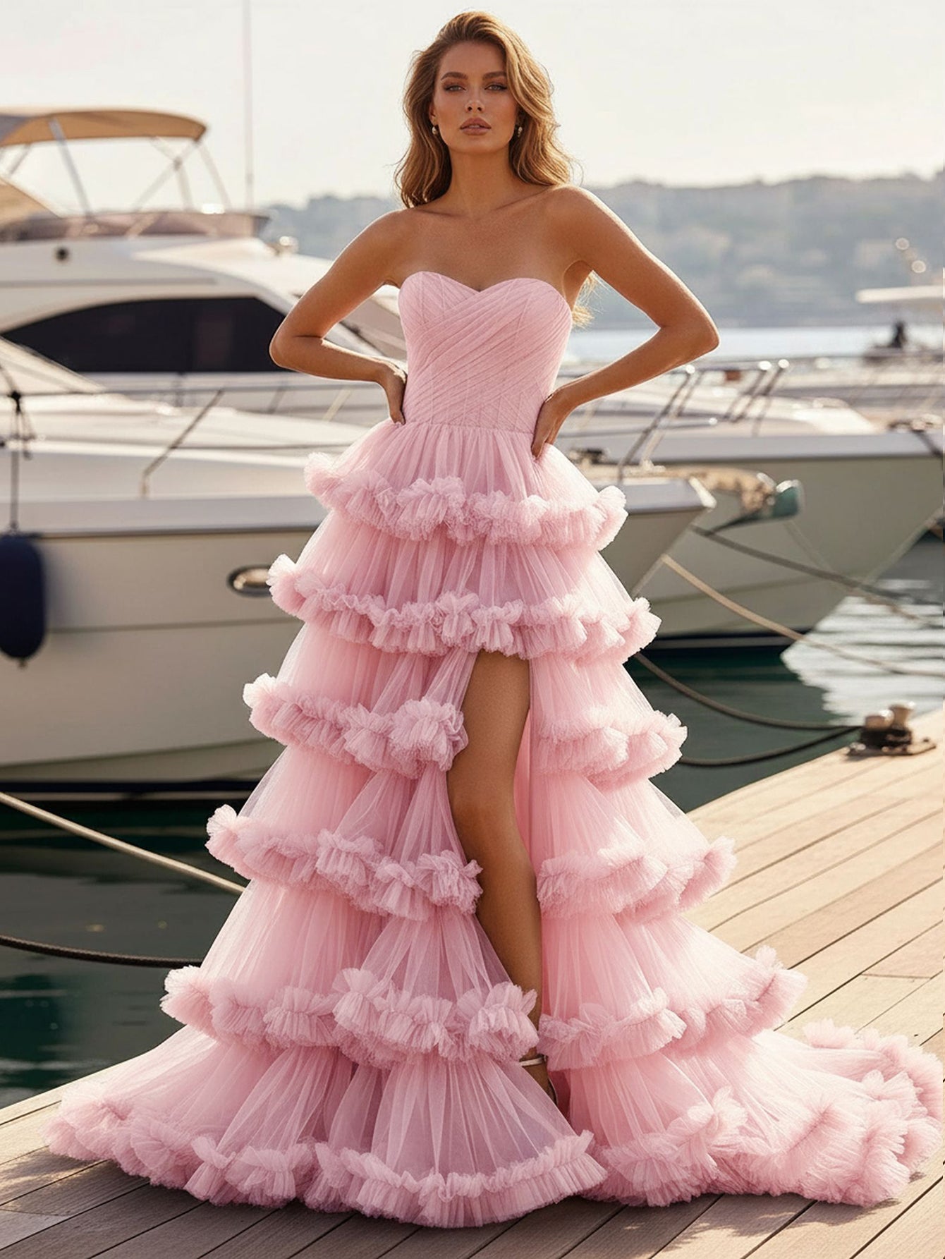 This layered prom dress features ruched bust and ruffle hem on the bodice. The strapless dress for prom has a sweetheart neck and tiered sheer hem. The corset top prom gown is ideal for graduation party, homecoming or prom party.