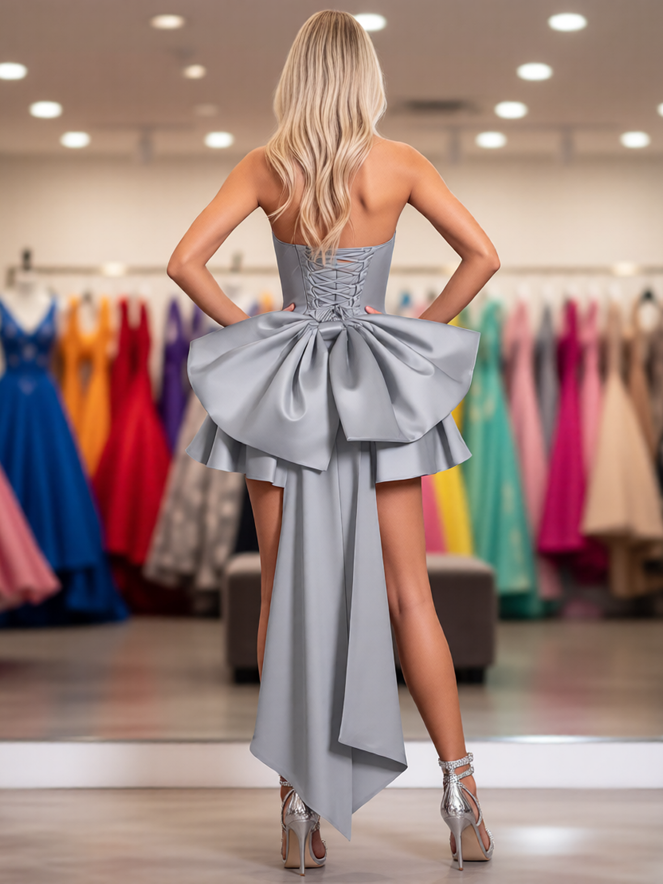 Removable Big Bow Bridal Prom Mini Dress - Silver