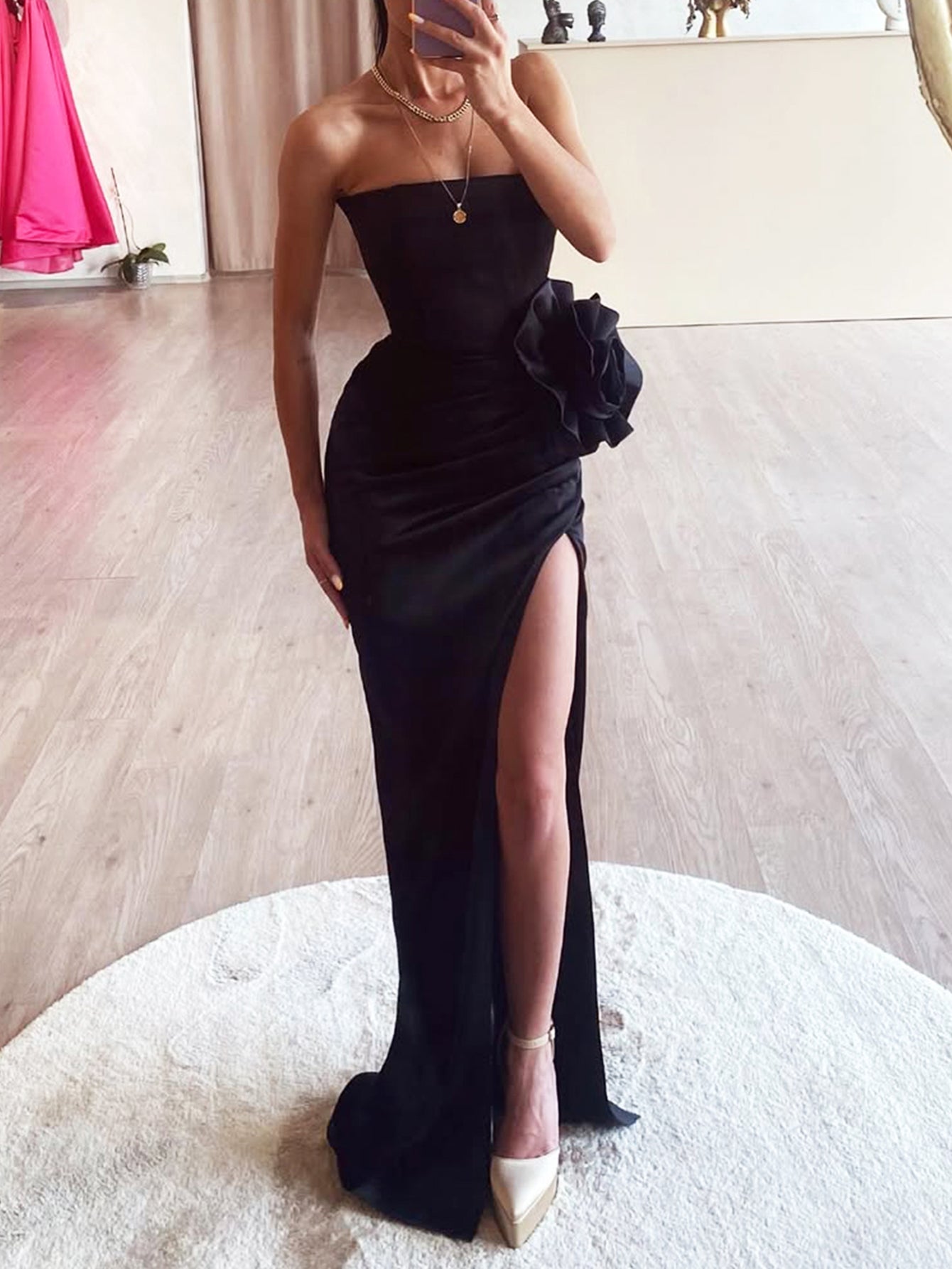 Removable Handmade Flower Strapless Long Prom Dress - Black