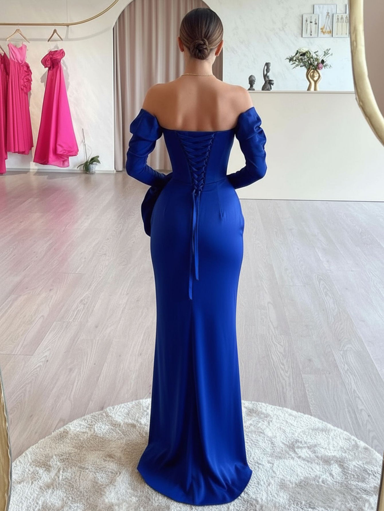 This satin prom gown features removable handmade flower on the bodice. The strapless long dress has a split hem. Worldprom ruched prom dresses are ideal for party, evening or festivals.