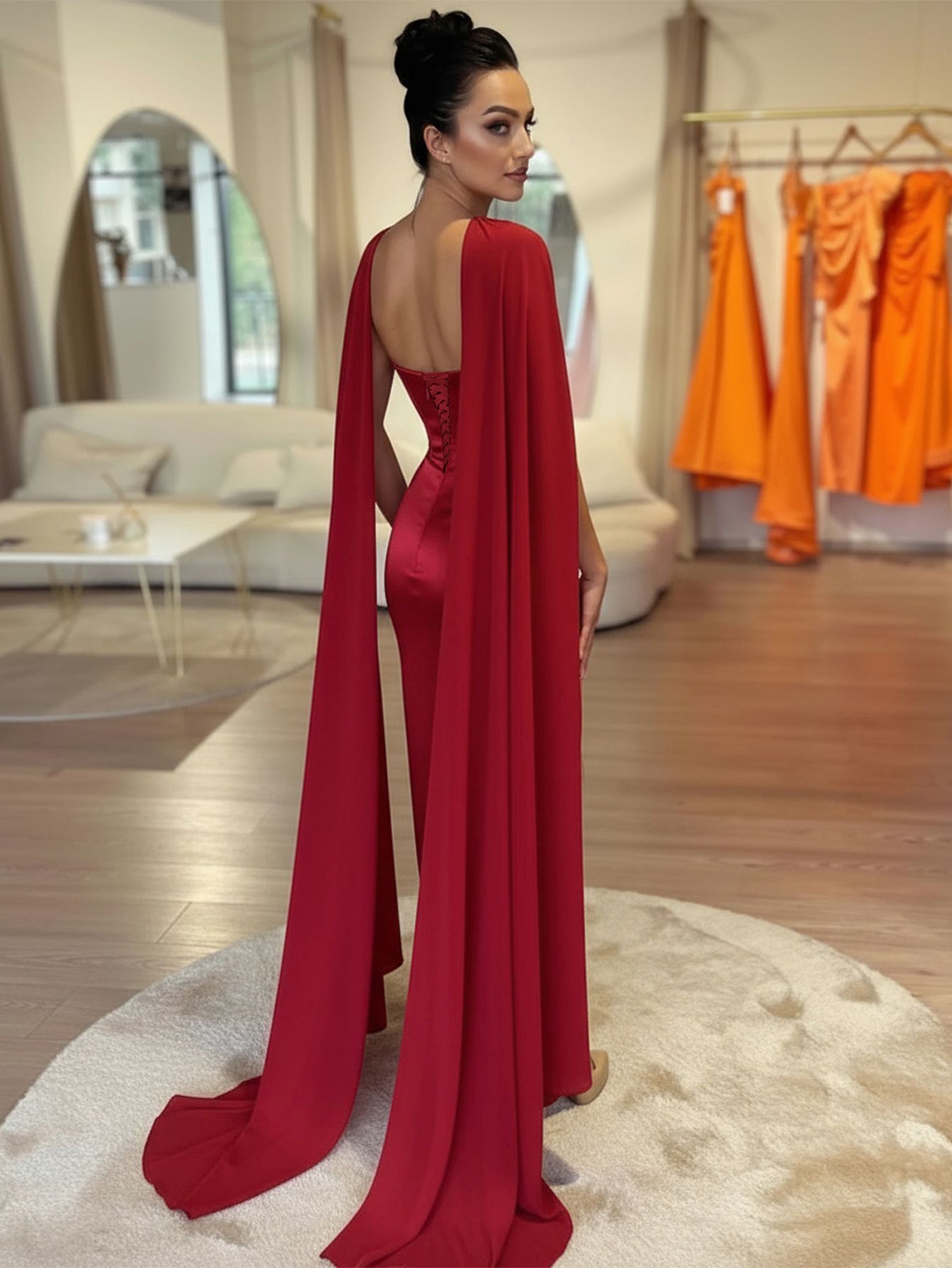 Removable Shawl Crystal Strapless Sheath Long Prom Dress - Red
