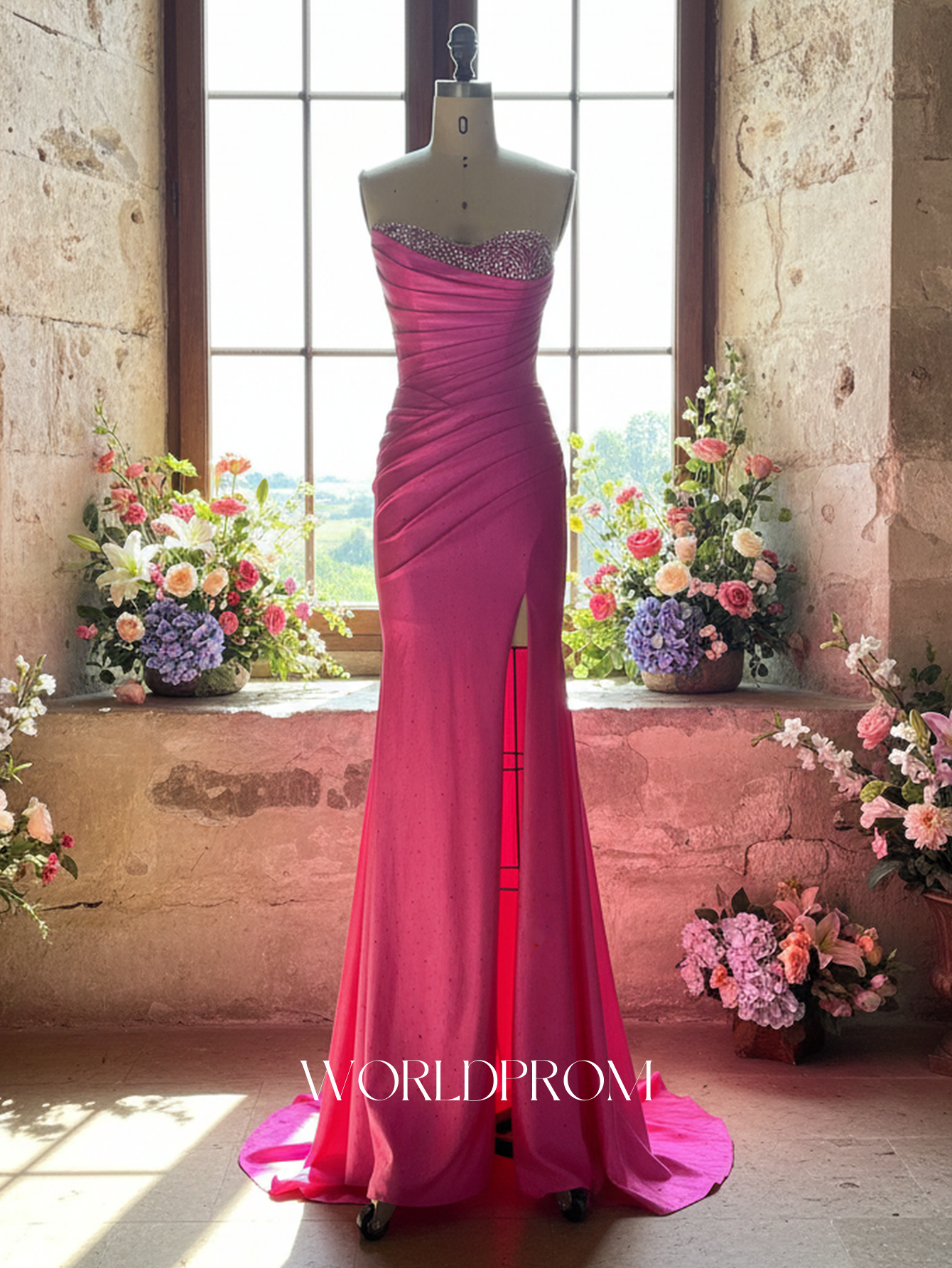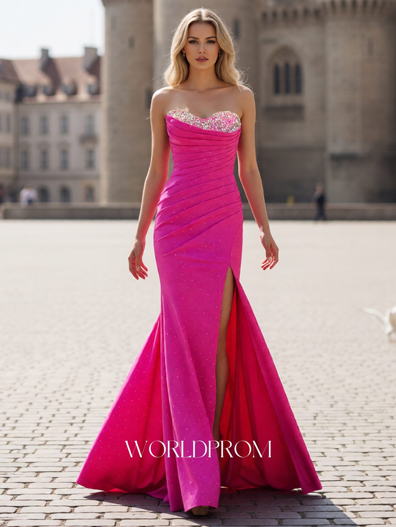 This satin prom gown features crystal ruched bust with hot fix on the bodice. The lace up dress has a sweetheart neckline and split hem. Worldprom mermaid prom dresses are ideal for party, evening or festivals.