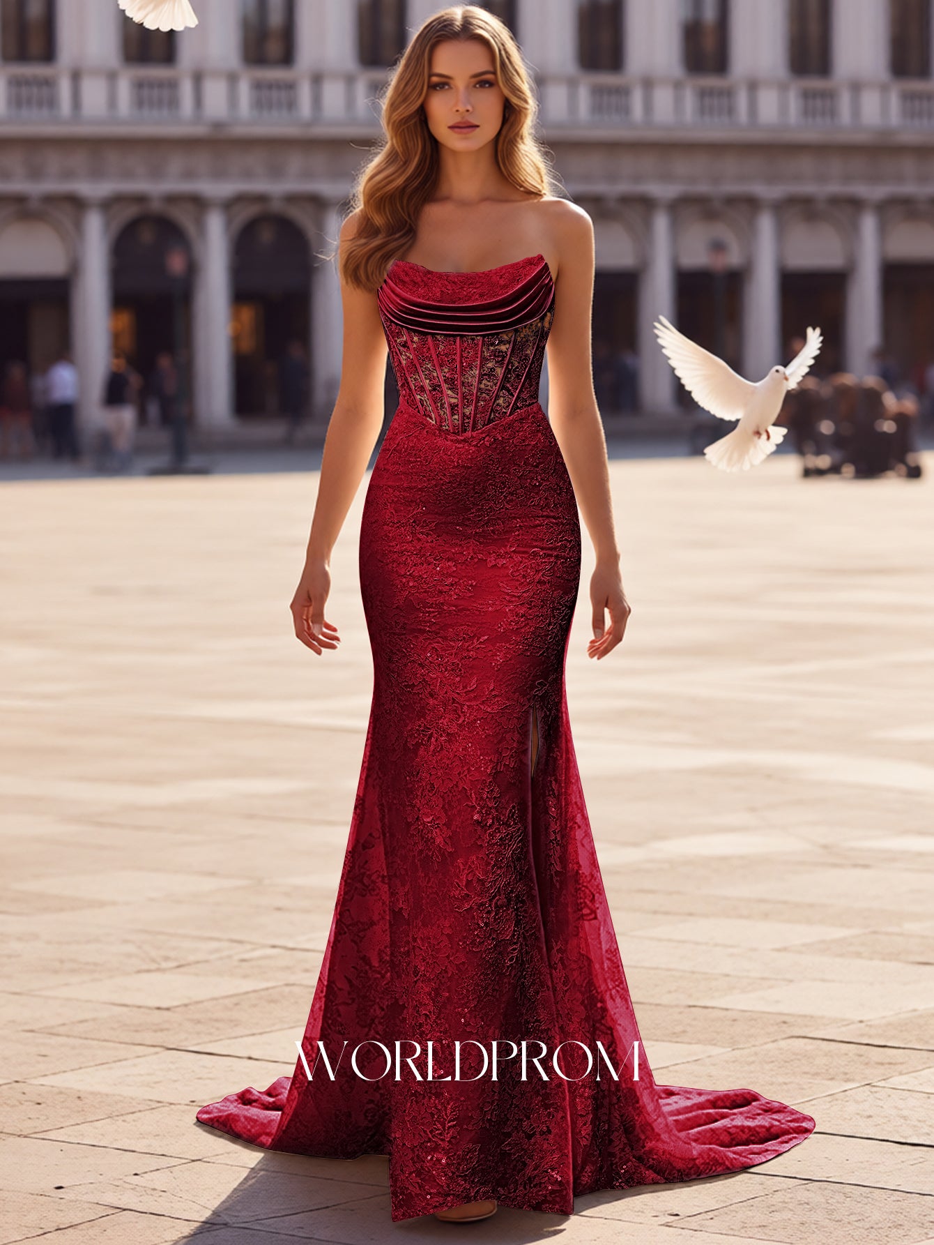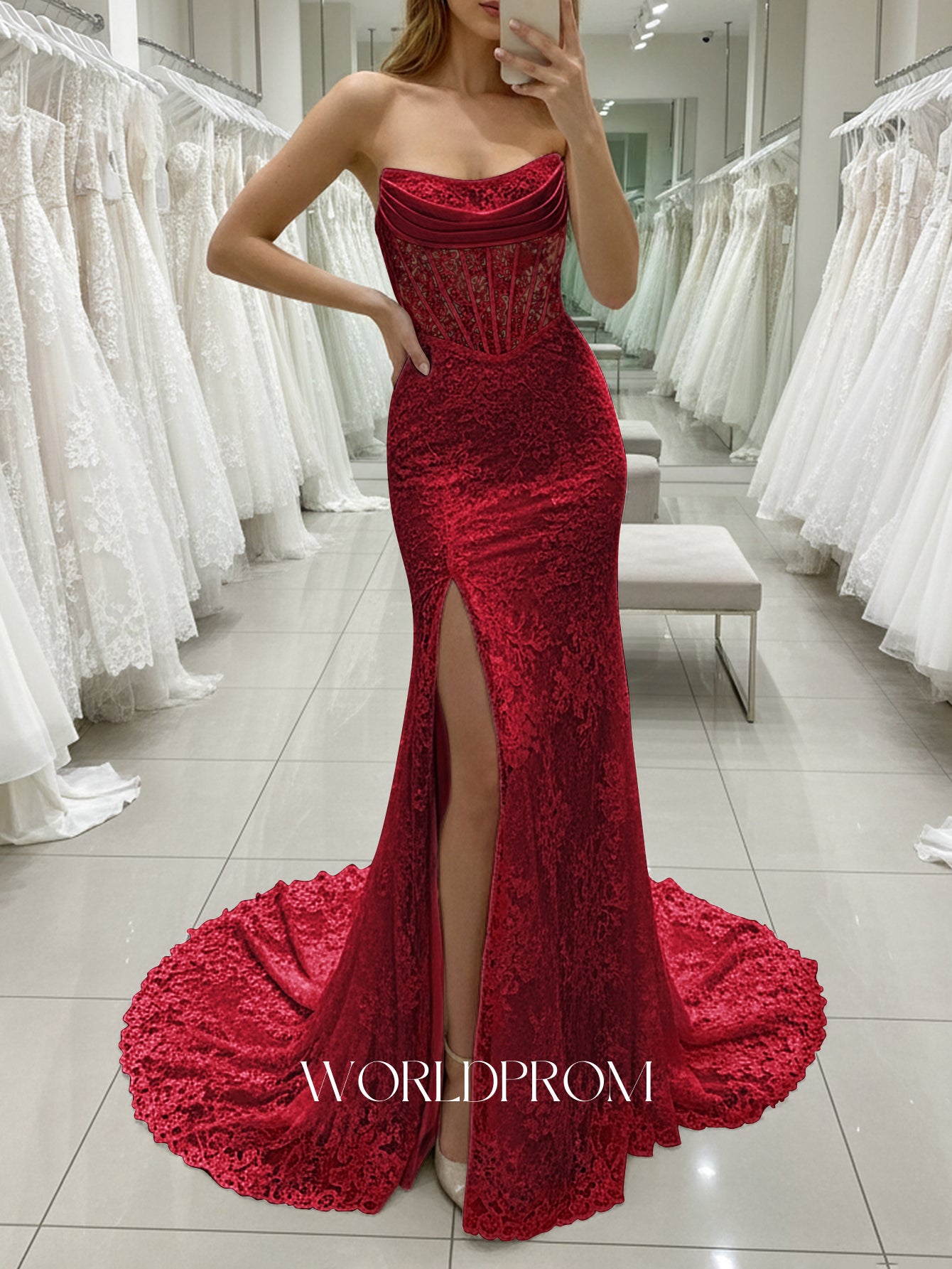 This lace prom gown features ruched embroidery on the illusion bodice. The strapless dress has a scoop neckline and split hem. Worldprom mermaid prom dresses are ideal for party, evening or festivals.