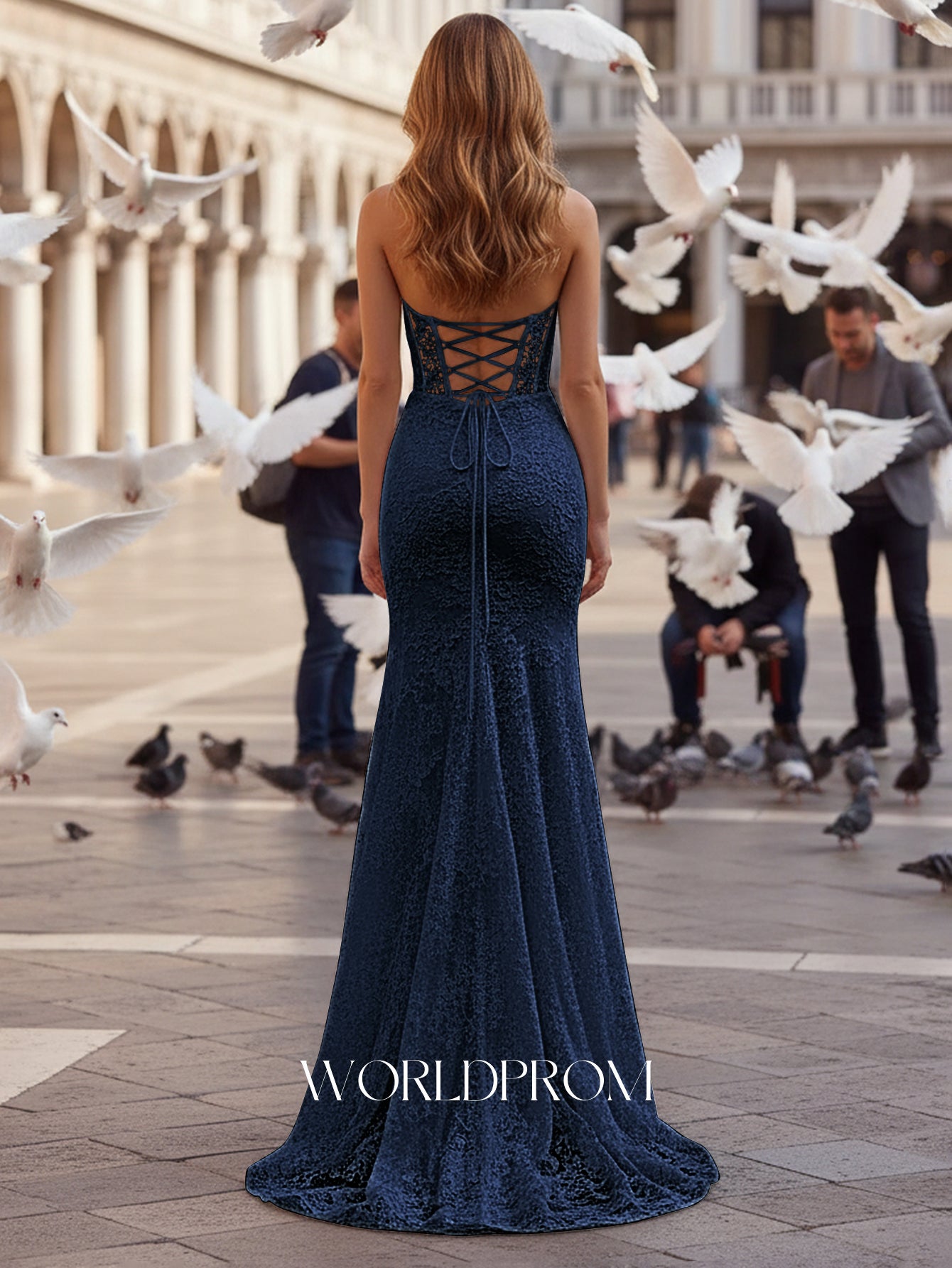 This lace prom gown features ruched embroidery on the illusion bodice. The strapless dress has a scoop neckline and split hem. Worldprom mermaid prom dresses are ideal for party, evening or festivals.