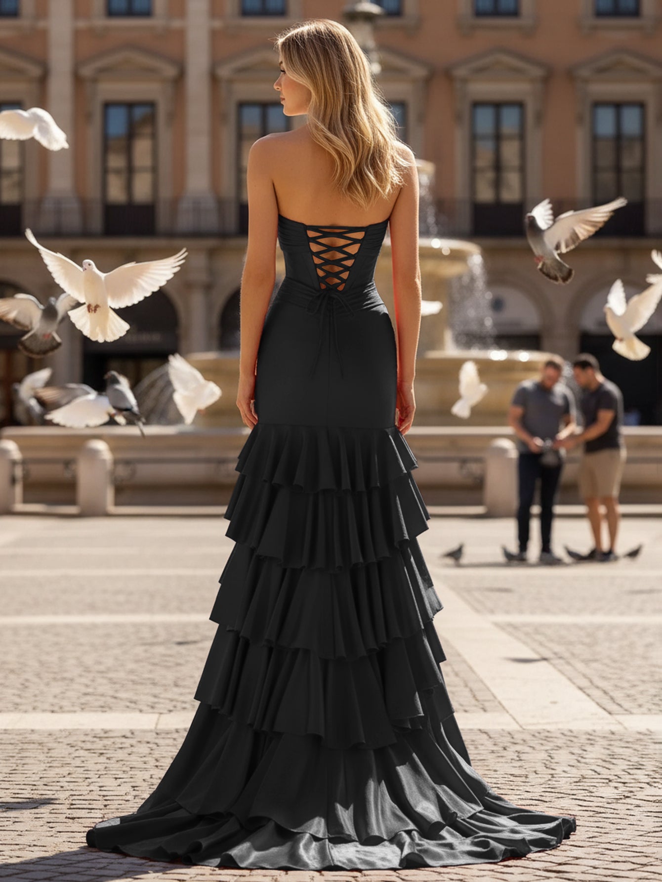Ruched Pleated Ruffle Lace Up Bodice Long Mermaid Prom Dress - Black
